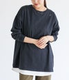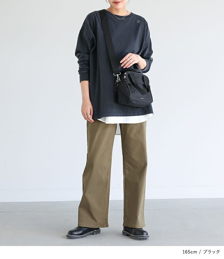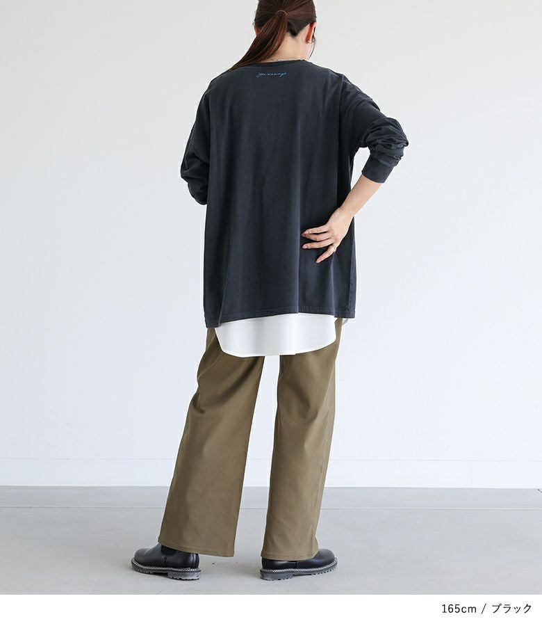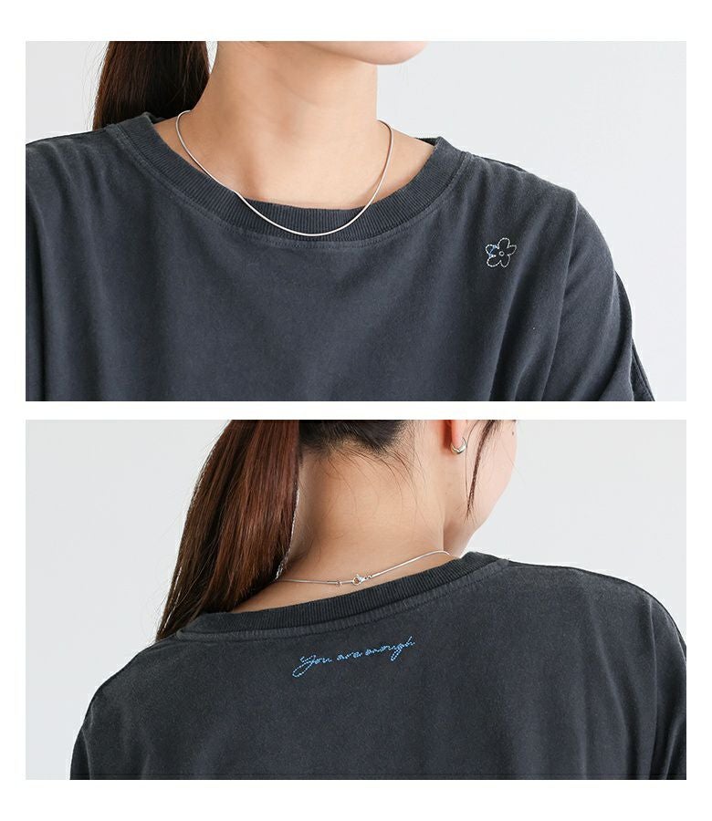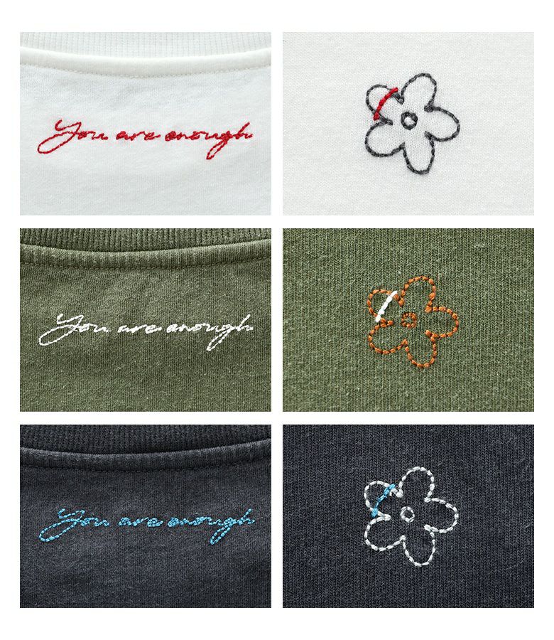 ヒップラインをカバーする丈感と、程よくゆったりしたシルエットがリラックス感のあるロンT。左肩に施された小さなお花のワンポイント配色刺繍がさりげないアクセントです。背中の英字刺繍は、控えめながらも温かみのある「あなたのままでいい」というメッセージが込められています。