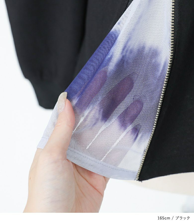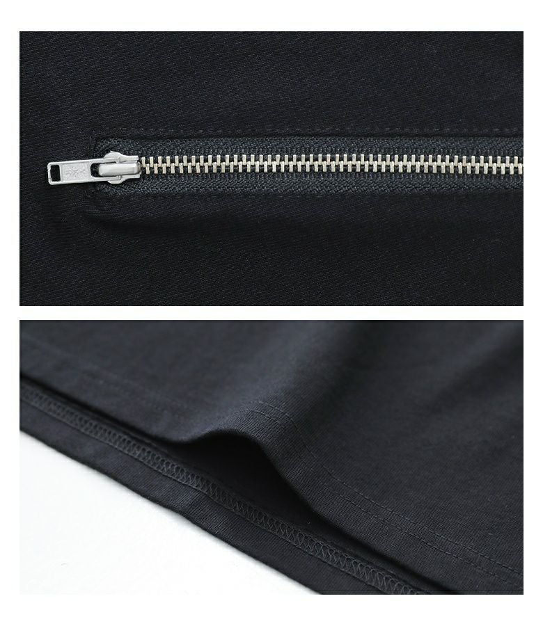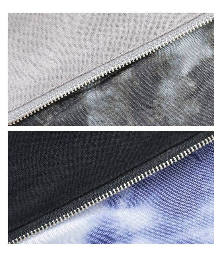 アシンメトリーに配置されたファスナーとニュアンス柄が目を惹く、柄切り替えファスナーカットソー。ファスナーを開けると、さりげなく柄生地がのぞくお洒落なデザインです。柄生地は少し透け感のある配色ニュアンス柄を使用。暑苦しくない軽やかな印象で、コーディネートのアクセントになります。