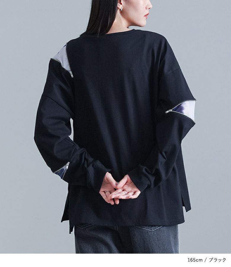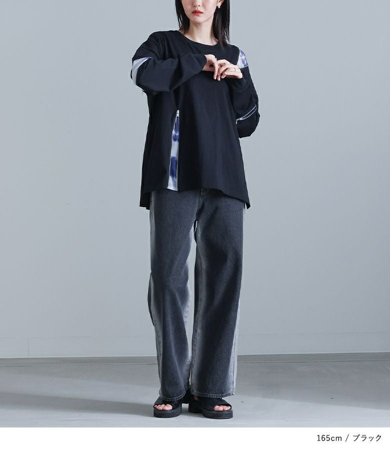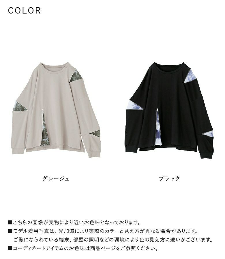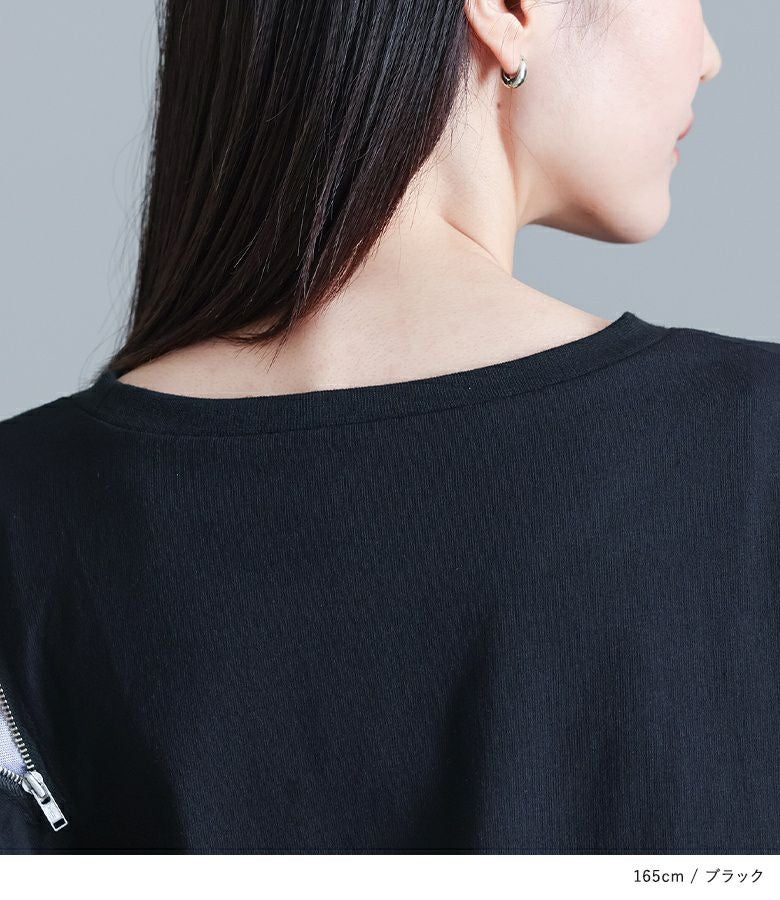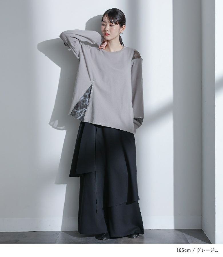 アシンメトリーに配置されたファスナーとニュアンス柄が目を惹く、柄切り替えファスナーカットソー。
