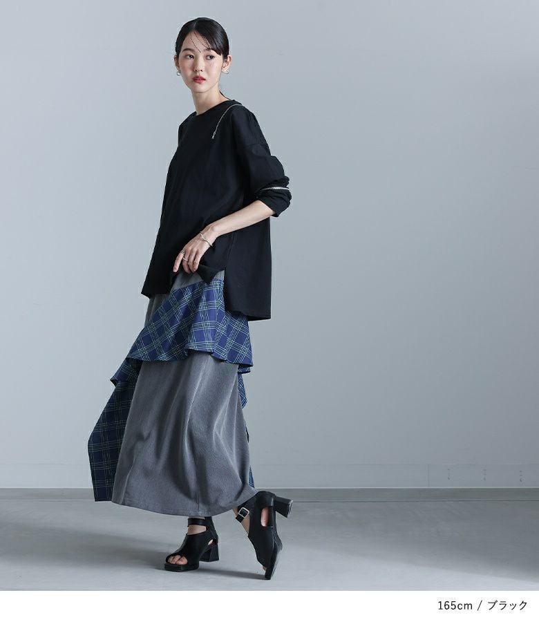 シンプルなボトムスはもちろん、変形デザインのスカートなどと合わせてモードなスタイルが完成。ファスナーの開け閉めで着方を変えられるので、着回し力も兼ね揃えるトップスです。