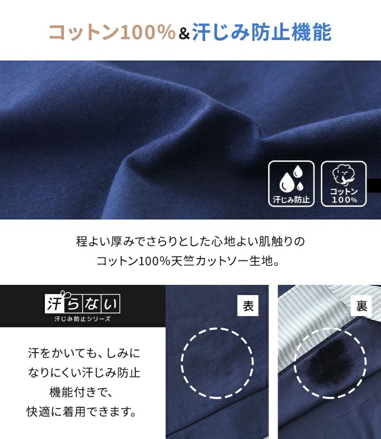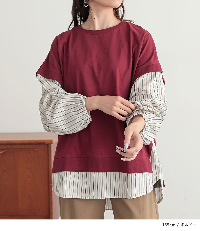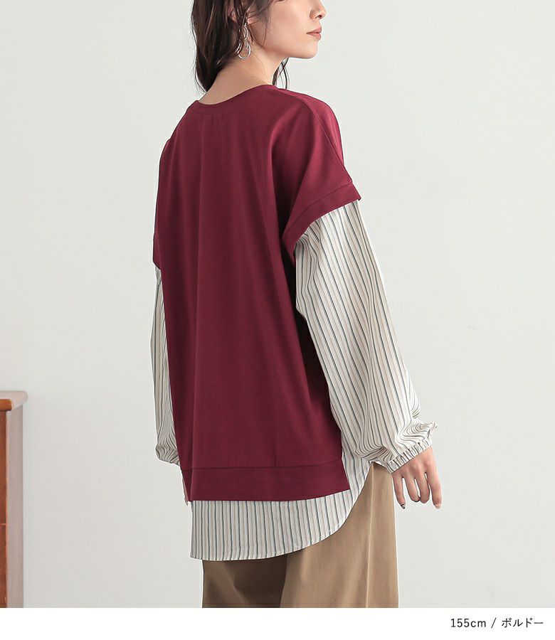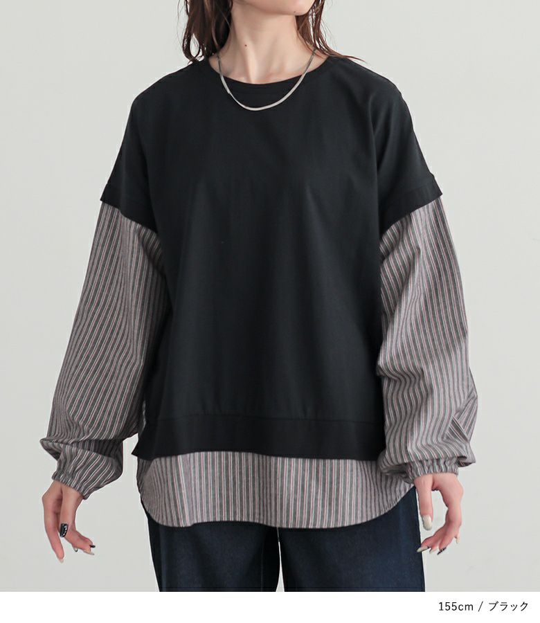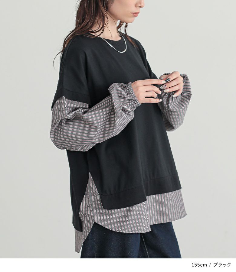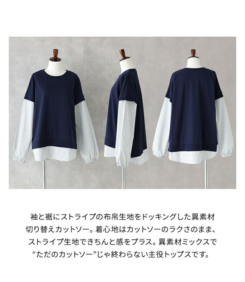 汗じみ防止機能付き♪ストライプ生地をドッキングした異素材切替カットソー。