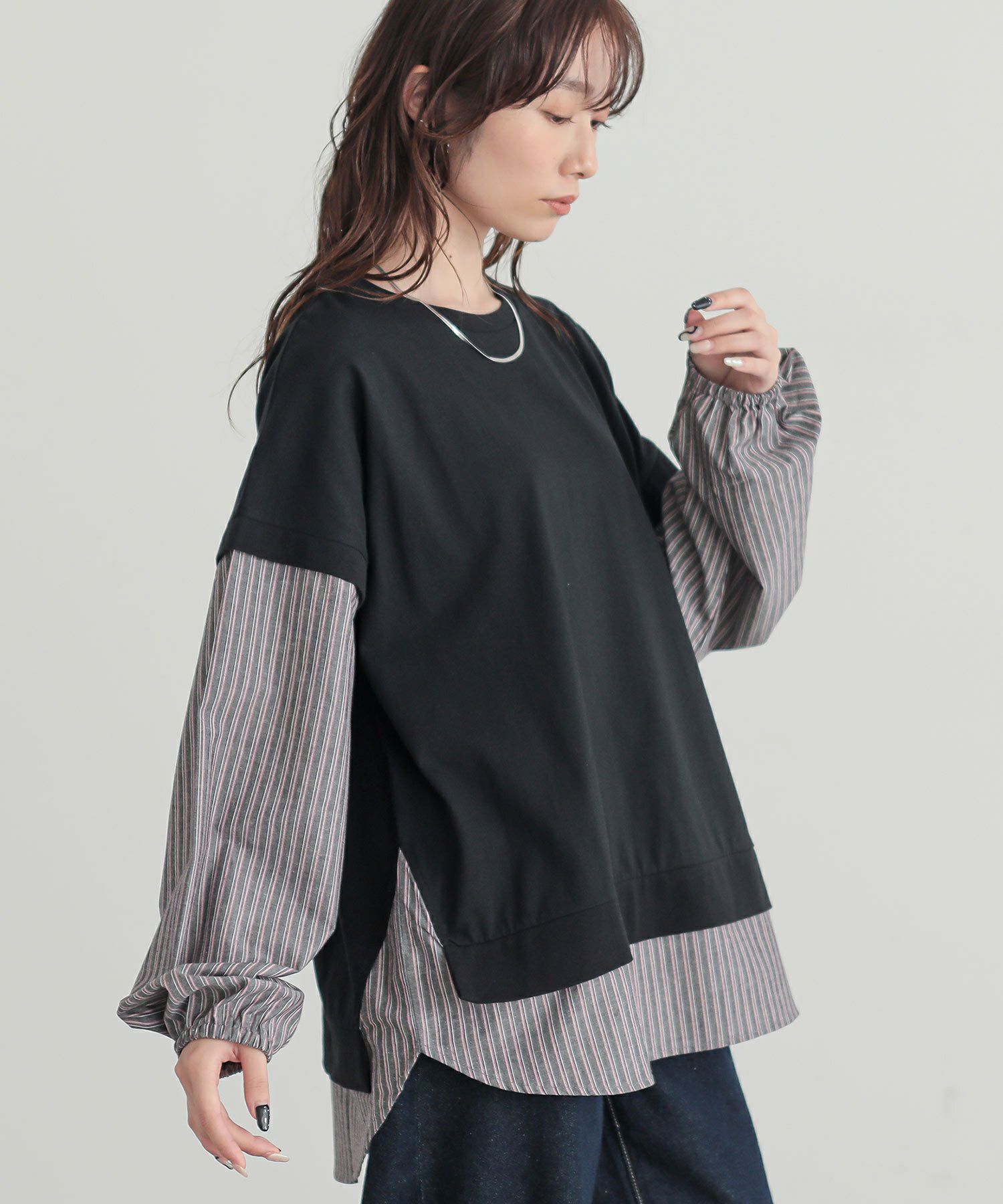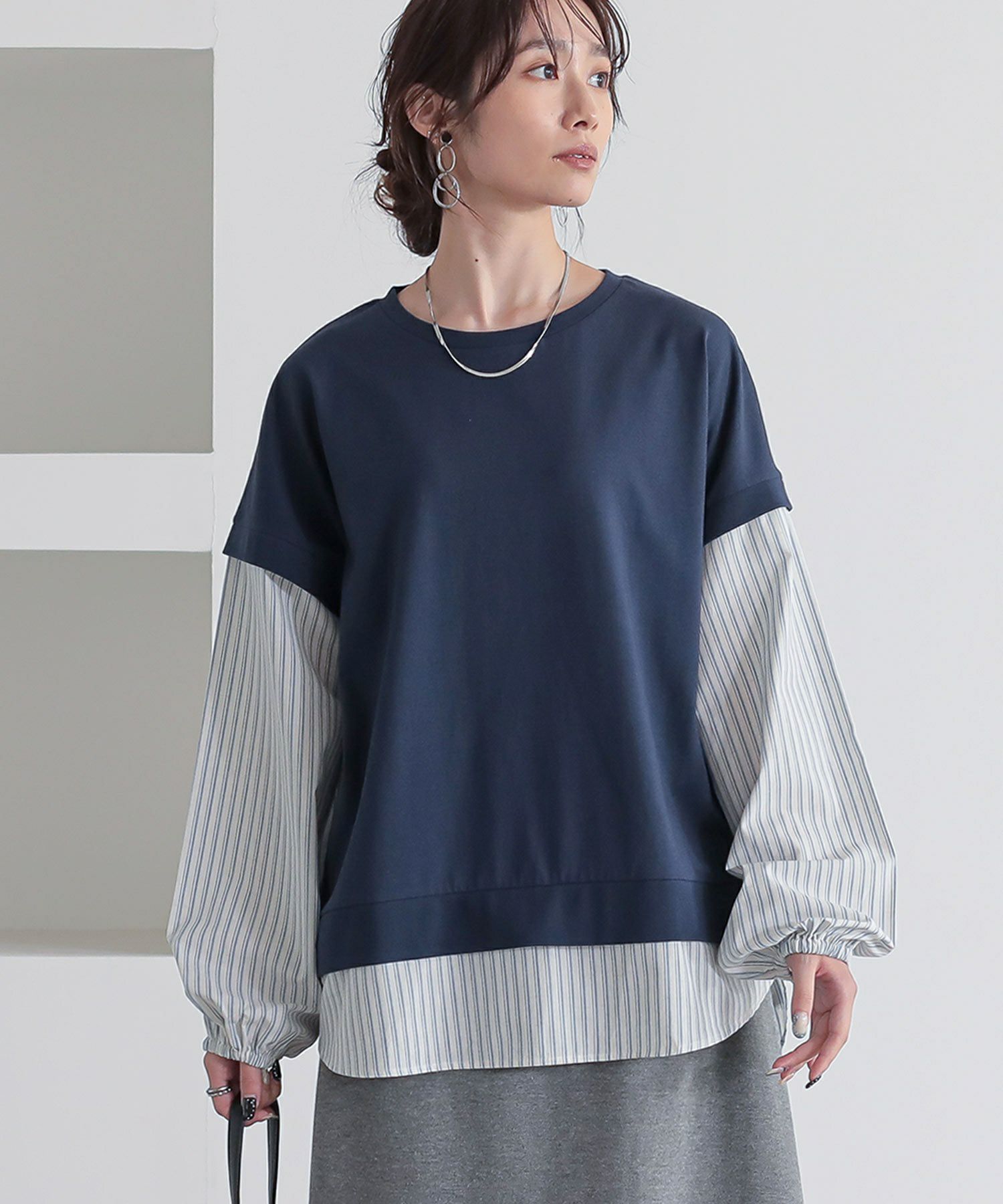 『n'OrLABELストライプ異素材切替カットソー』