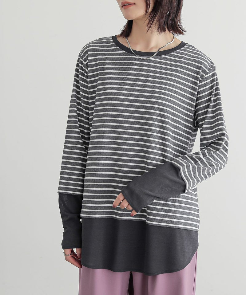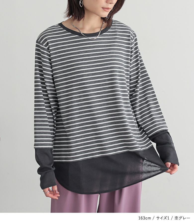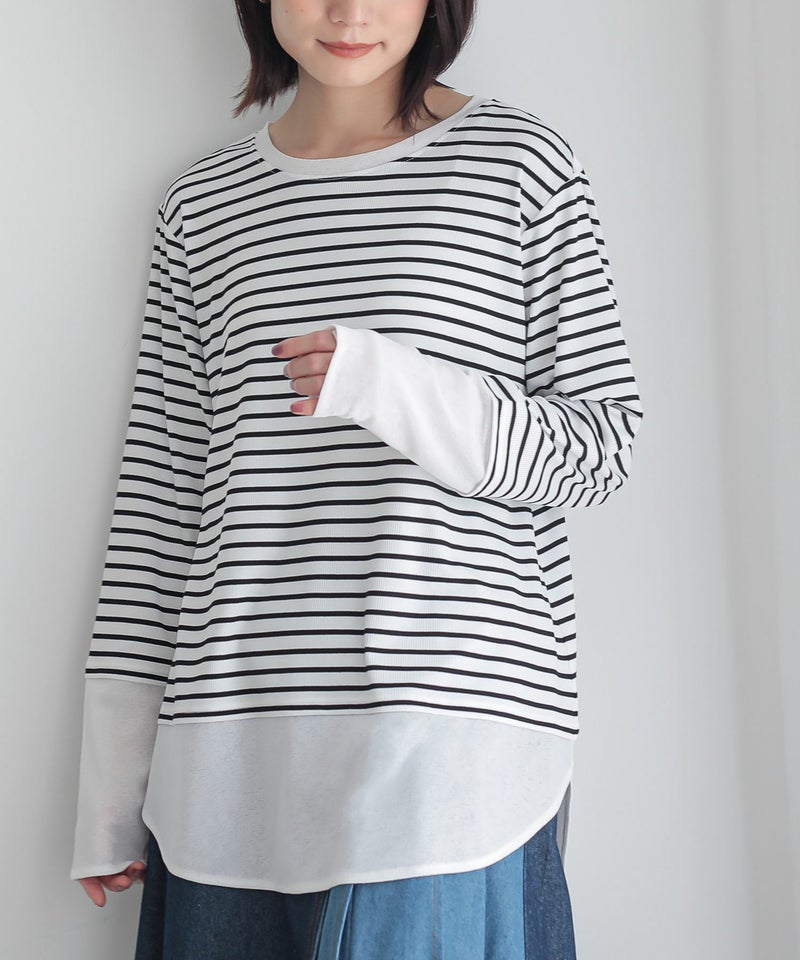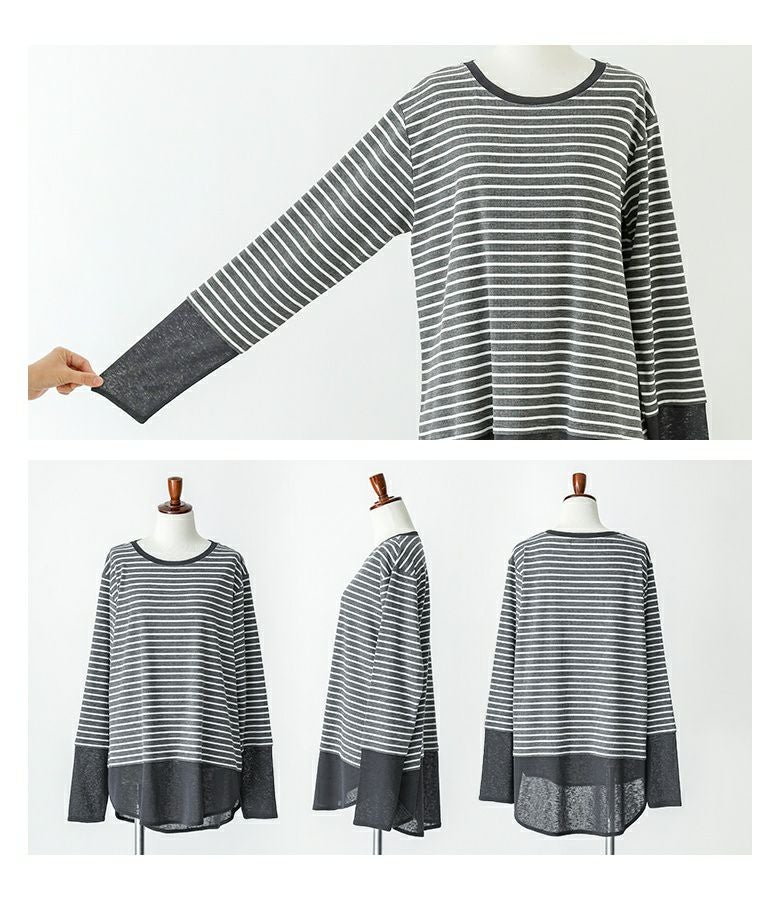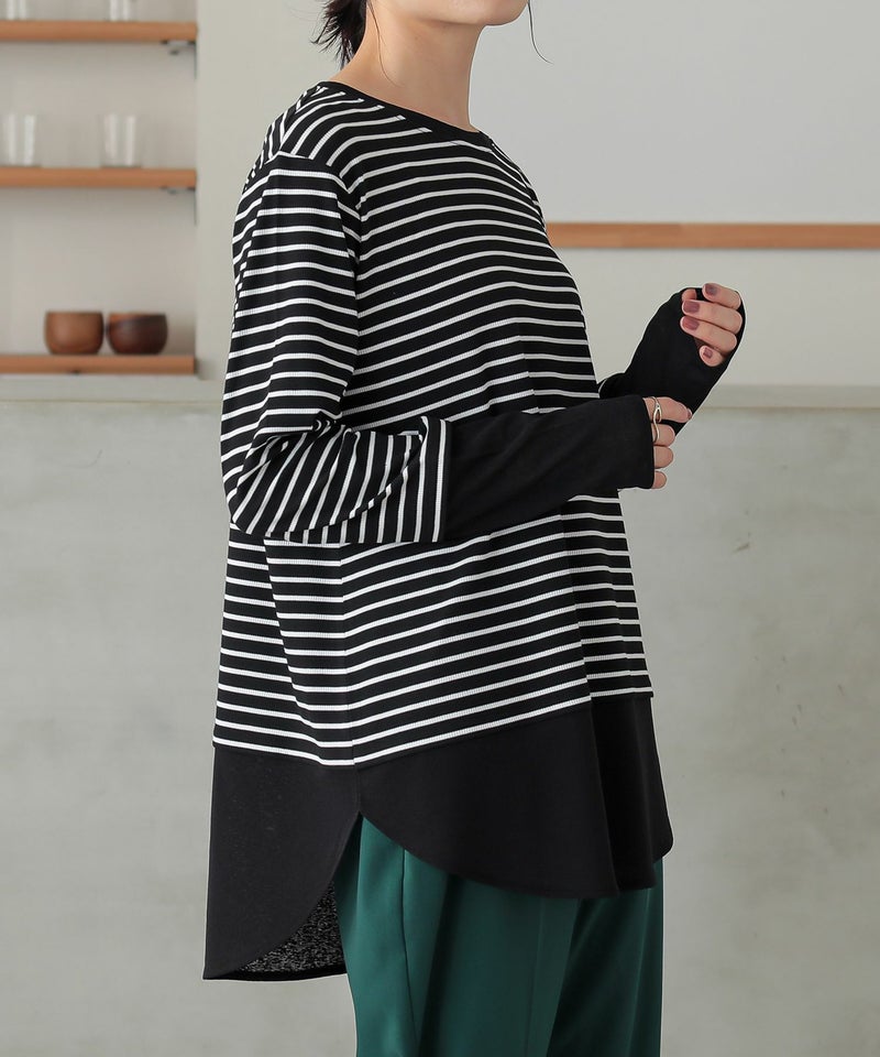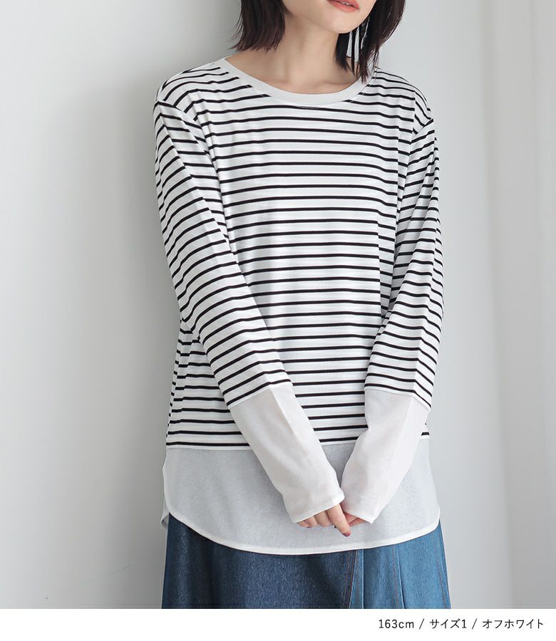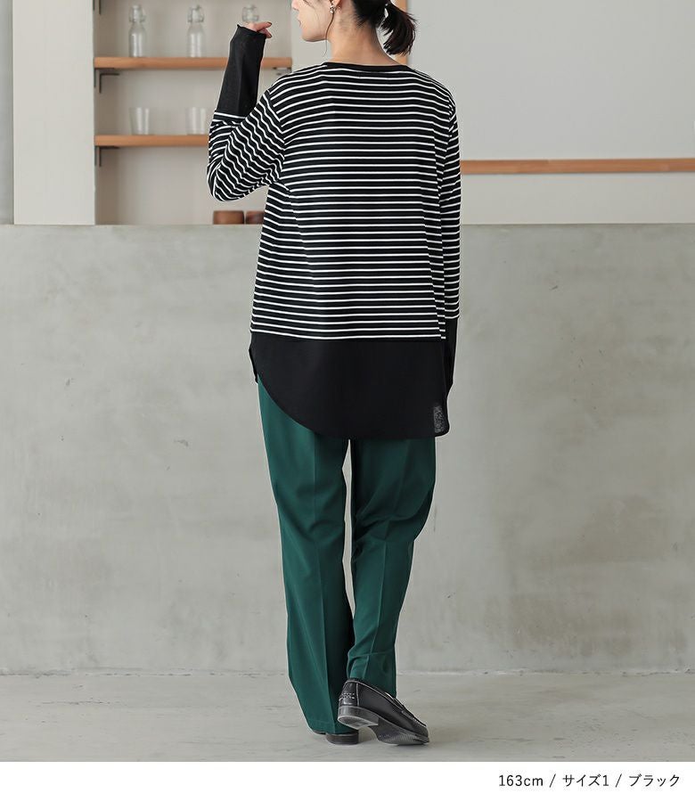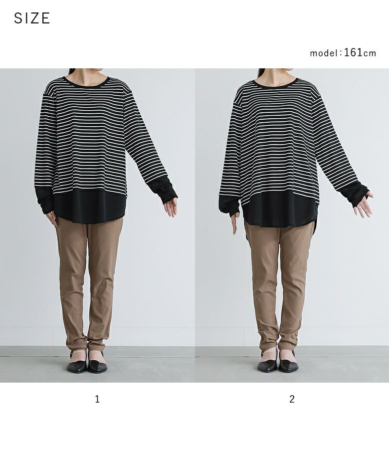 【普段着用】 Tops: M Bottoms: M/L | 【1】 袖丈:指の真ん中位 着丈:ヒップ真ん中より上位 腕周り:ややゆったり バスト:ゆったり 全体:スッキリ