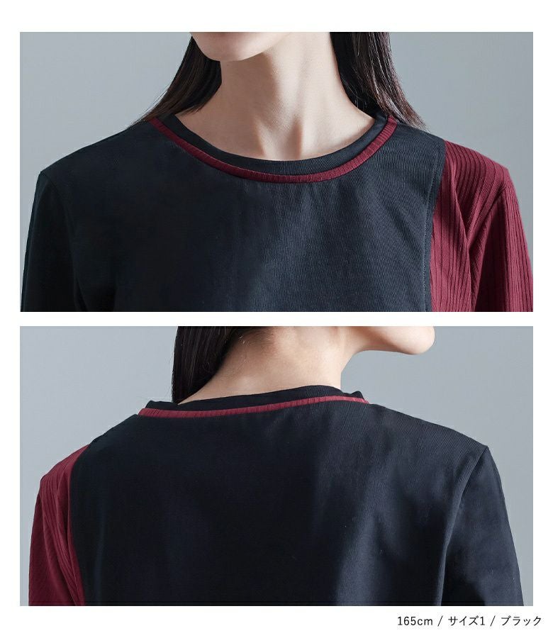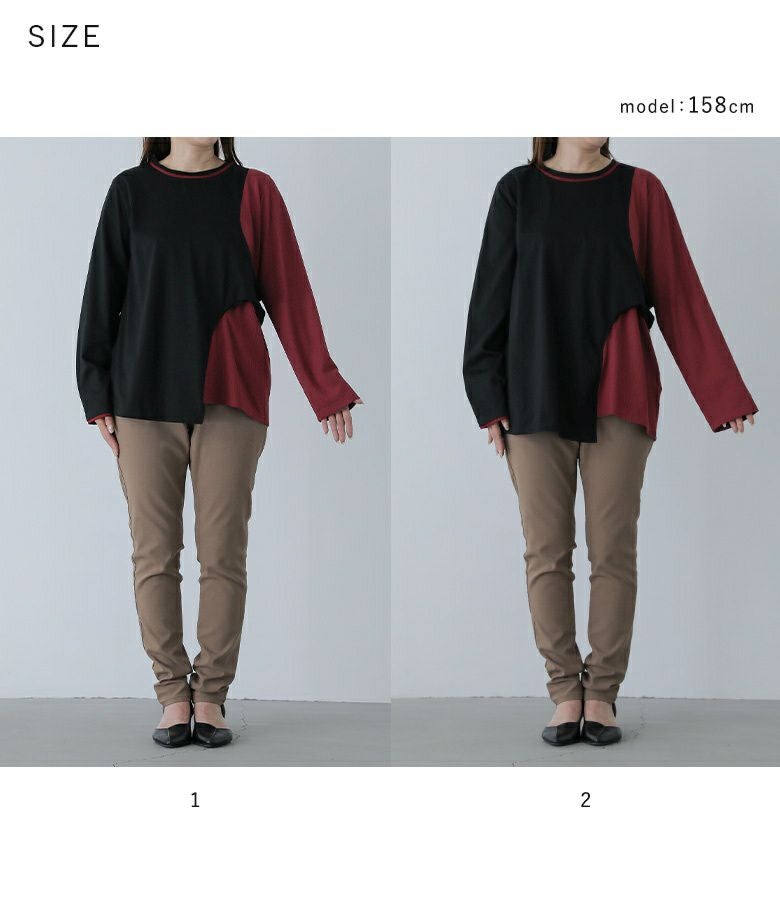 【普段着用】 Tops: M Bottoms: M/L | 【1】 袖丈:手の甲が隠れる位 着丈:ヒップ下少し見える位 腕周り:ややゆったり バスト:ゆったり 全体:ややゆったり