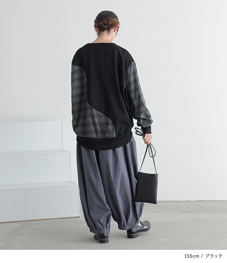 裾にリブが入っているので、ワイドなボトムスとも相性抜群です。