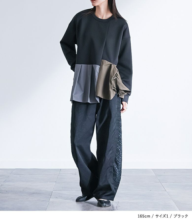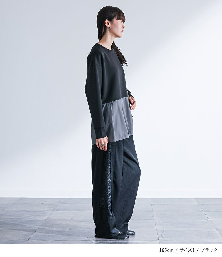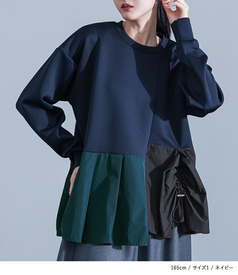 【普段着用】 Tops: M Bottoms: M/L | 【1】 袖丈:手の甲にかかる位 着丈:ヒップ下少し見える位 腕周り:ややゆったり バスト:ややゆったり 全体:スッキリ