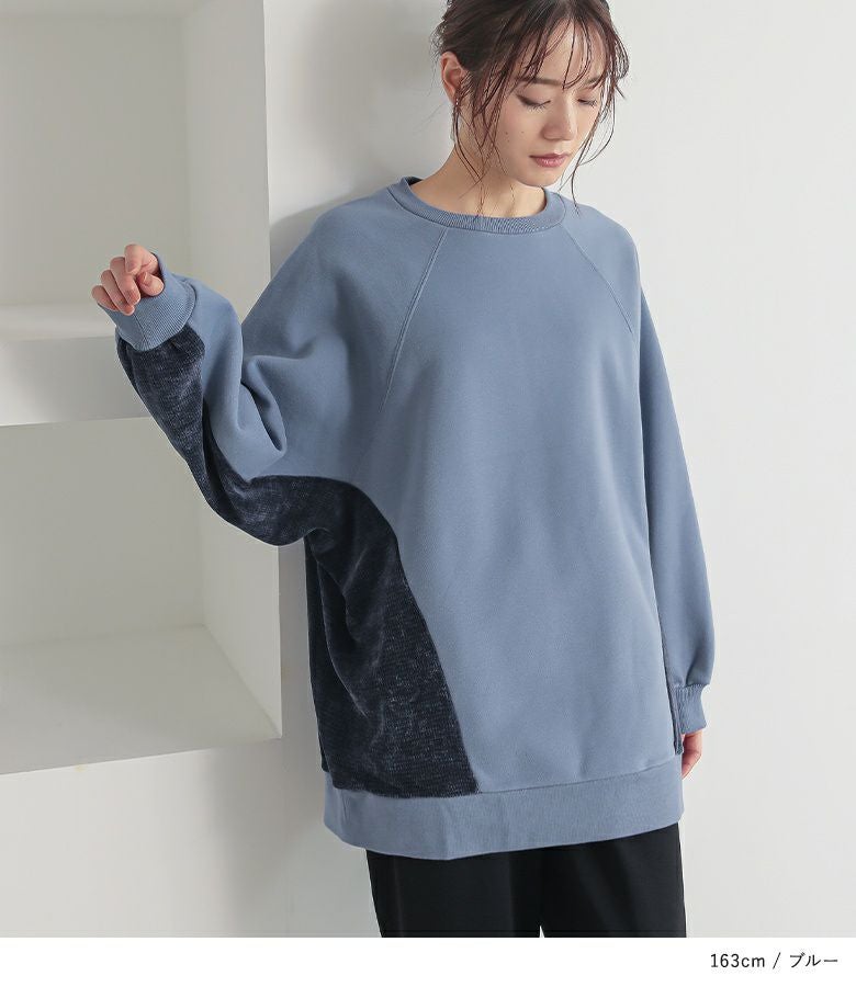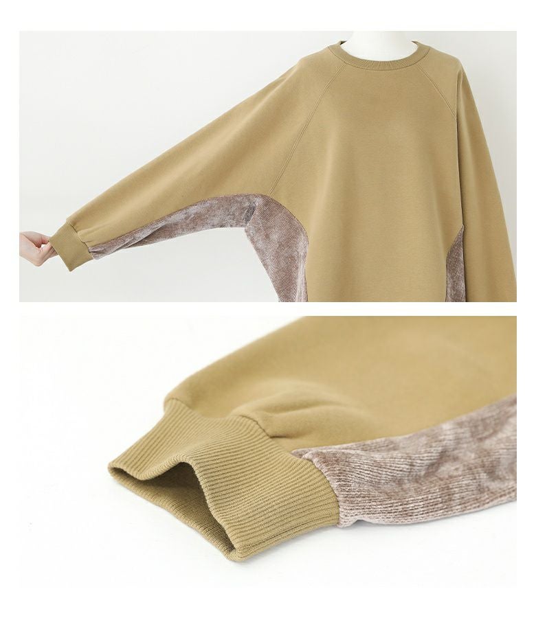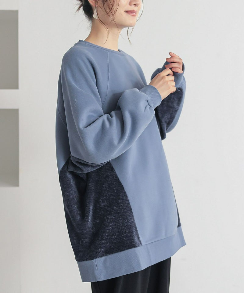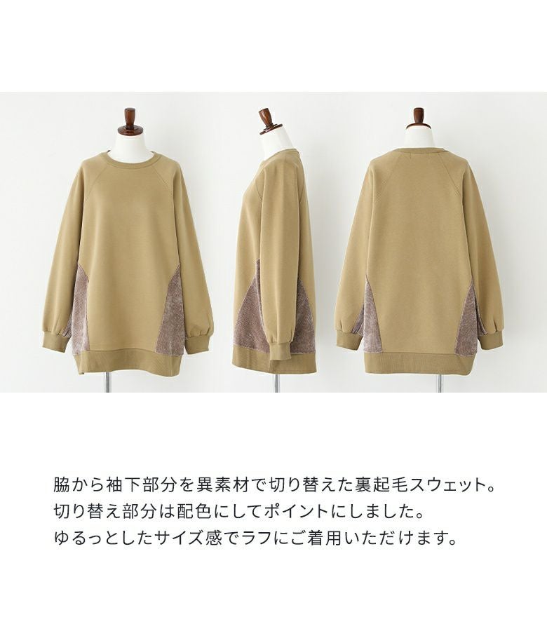 脇から袖下部分を異素材で切り替えた裏起毛スウェット。