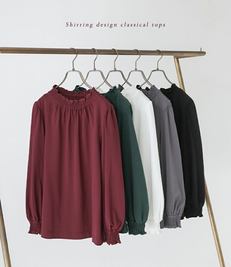 襟元と袖口のシャーリングが、センスの良い大人可愛さを演出する。こだわりのバランスだから、シンプルなのに一枚で簡単にお洒落映え。インして襟元や袖口からチラリと覗かせれば、お洒落女子の旬顔コーデが完成します。