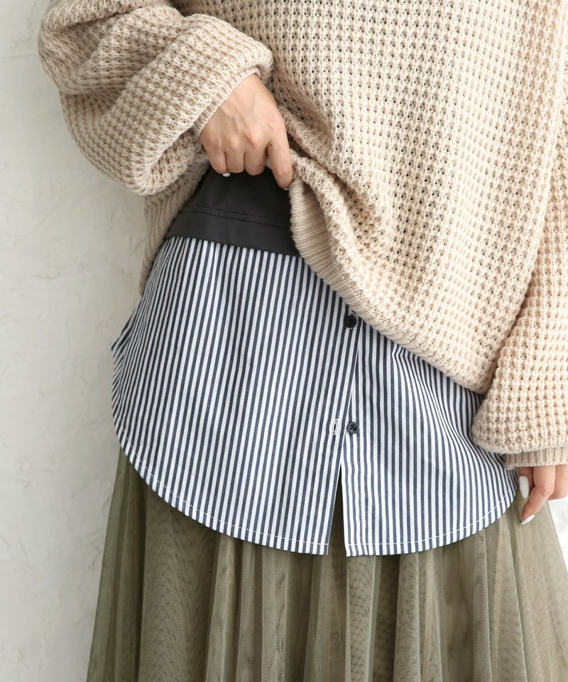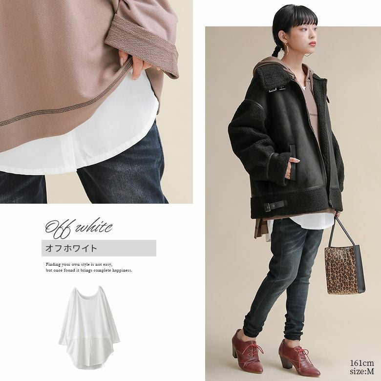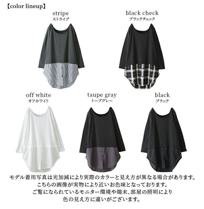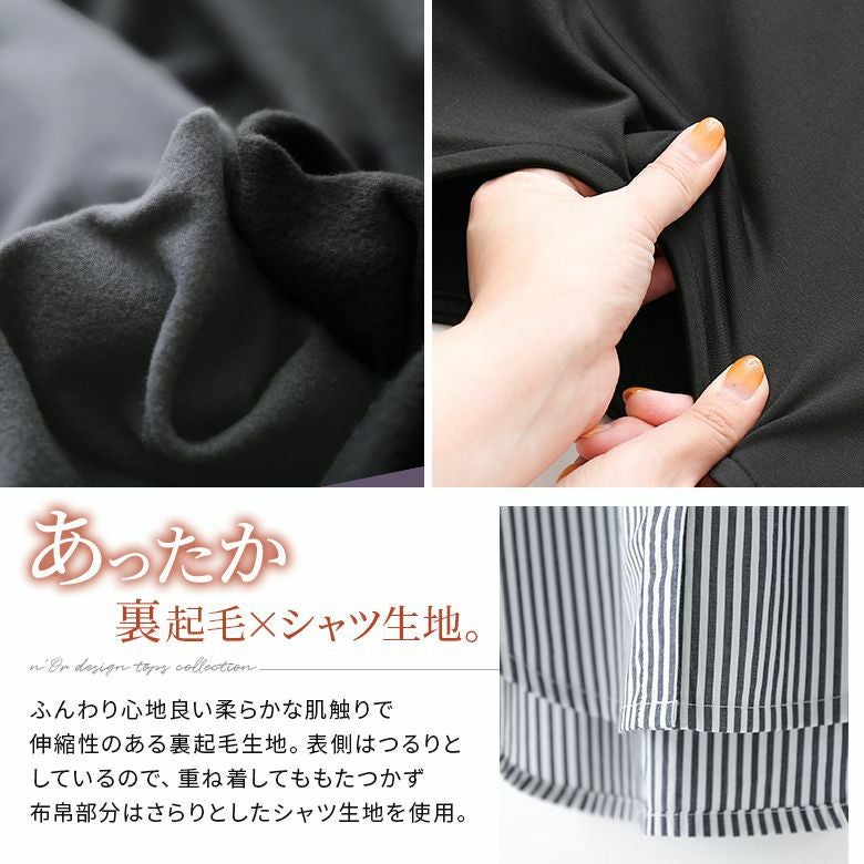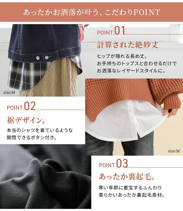 カットソー部分はふんわり伸縮性のある裏起毛素材で暖かく、裾シャツ部分は本当のシャツを着ているような開閉できるボタン付き。重ね着してももたつかない異素材使いが嬉しい♪