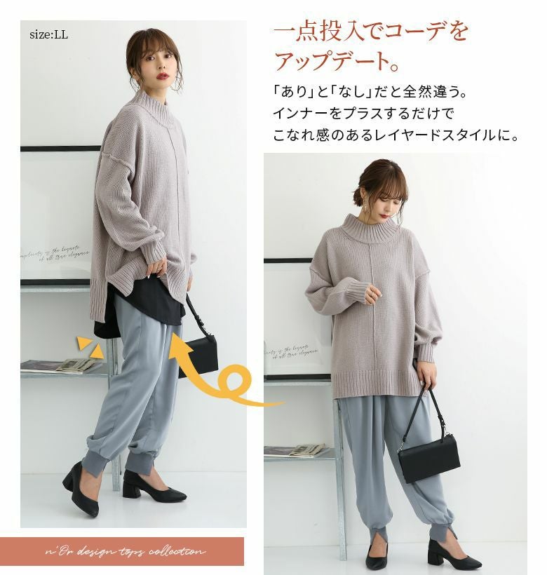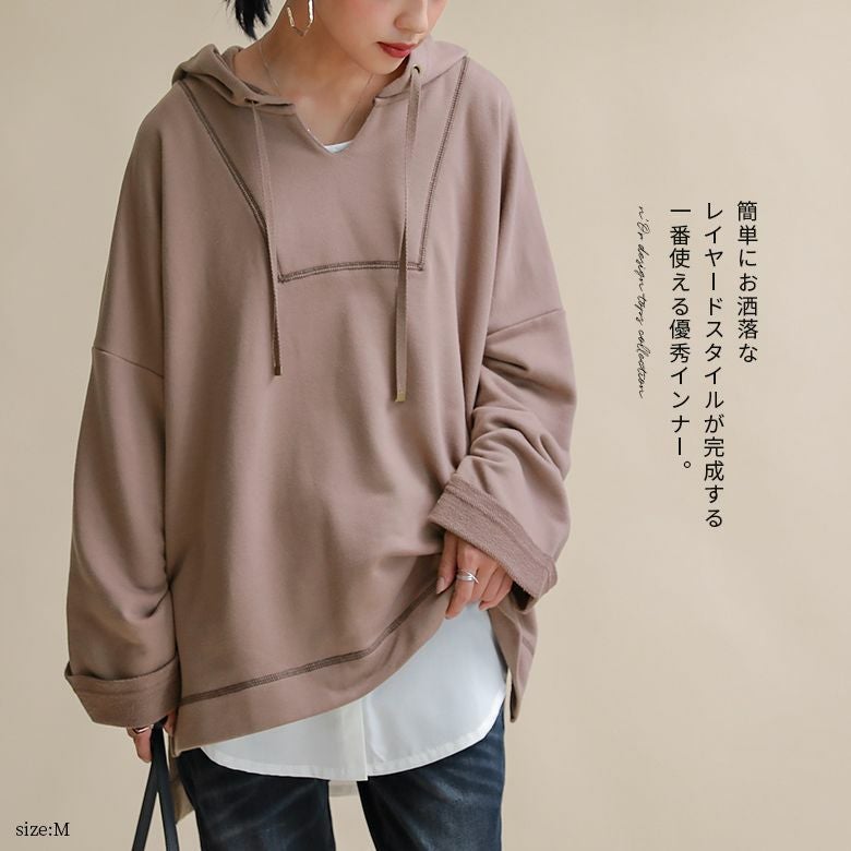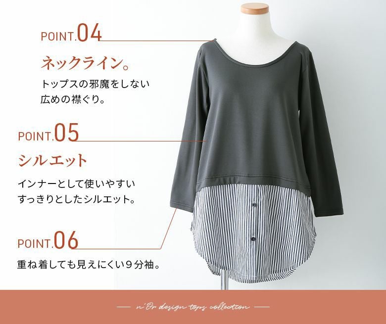 スッキリした広めの襟ぐり&長袖の下から見えない9分袖と、重ね着しやすいデザインにこだわりました。