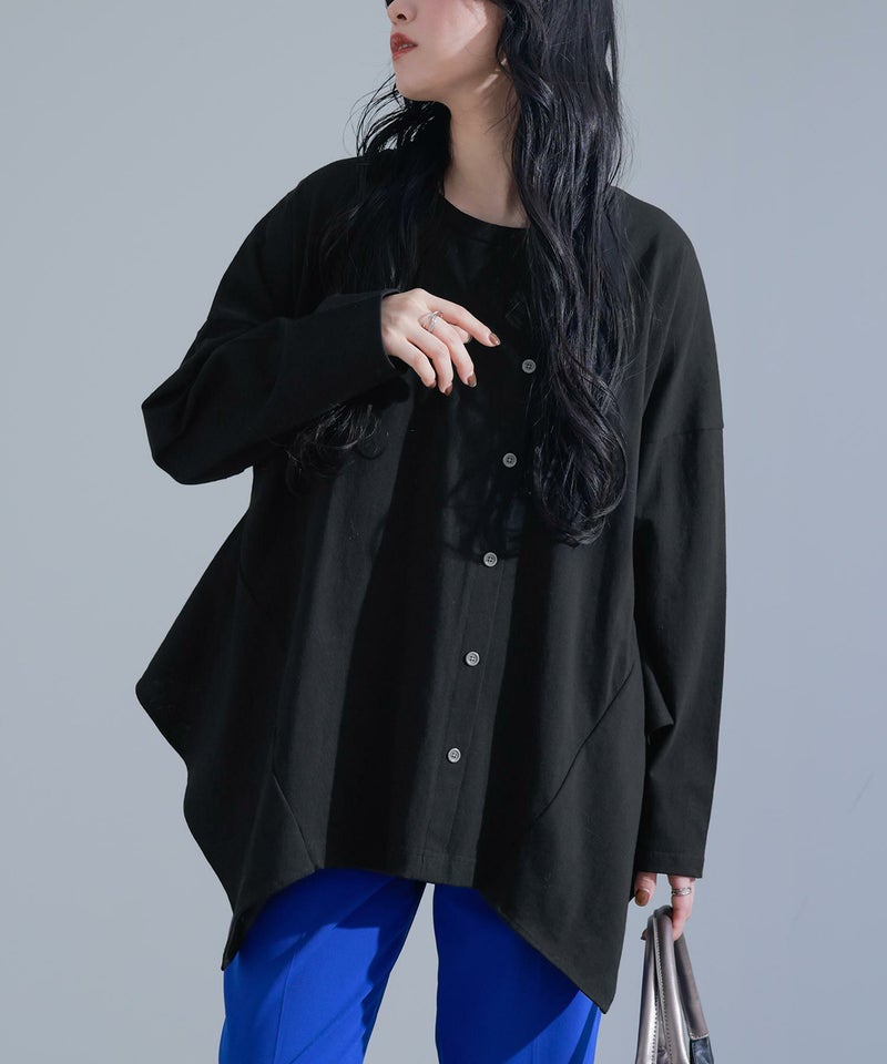 脇のドレープと、中心からずらして配置した飾りの金属調ボタンがポイントになるカットソー。綺麗なドレープが出るようにこだわり、揺れるとちらりと見える配色生地がさりげなくお洒落に差をつけます。