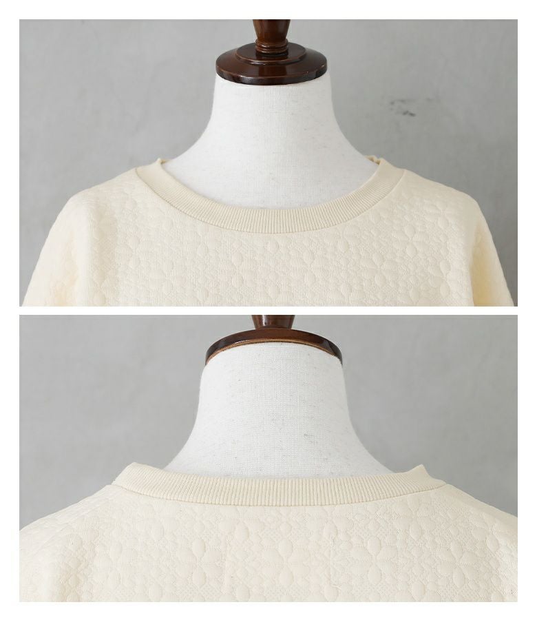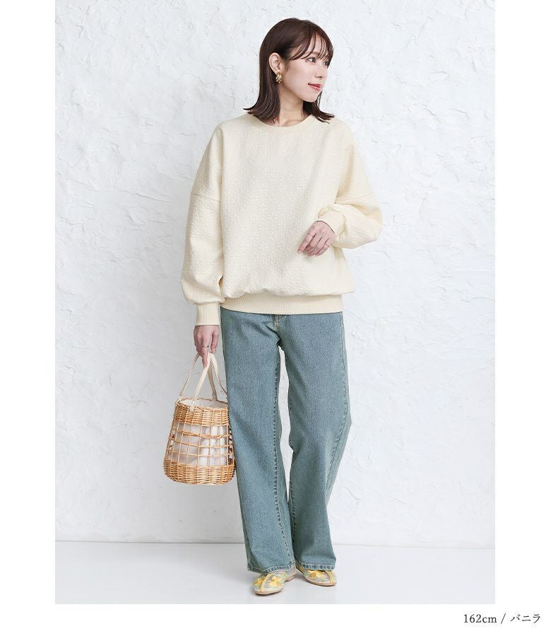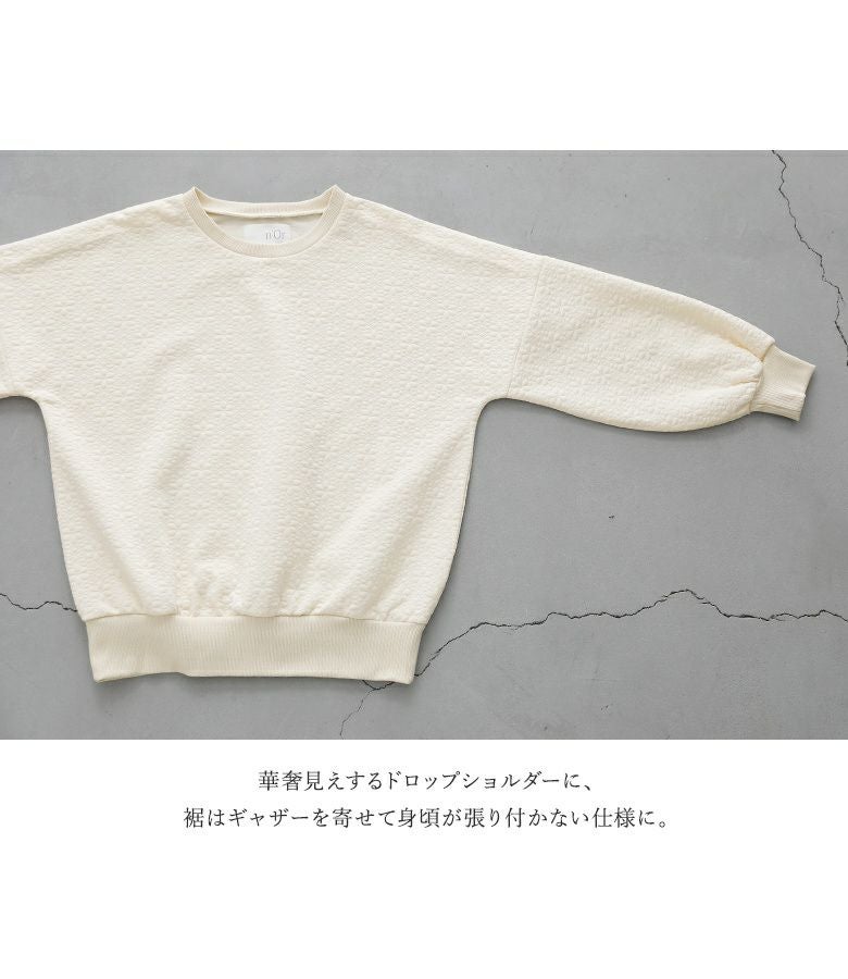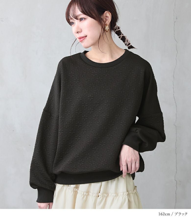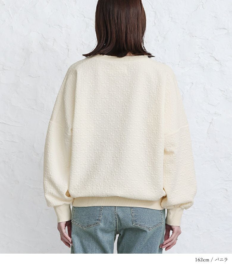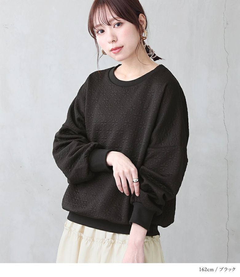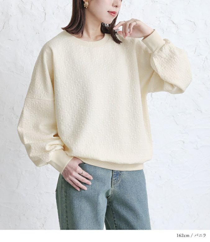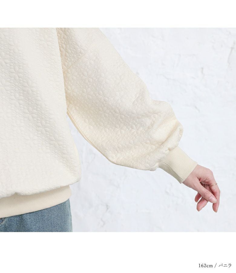 ぽこぽことしたタイル風の花柄ふくれジャカードが大人可愛いトップス。ラフに着用できるゆるっとしたシルエットに、袖口&裾はリブで締めて全体的にメリハリを出したデザイン。ぽわん袖が女性らしさをプラスして、デイリーにも品良く着用できる一枚です。