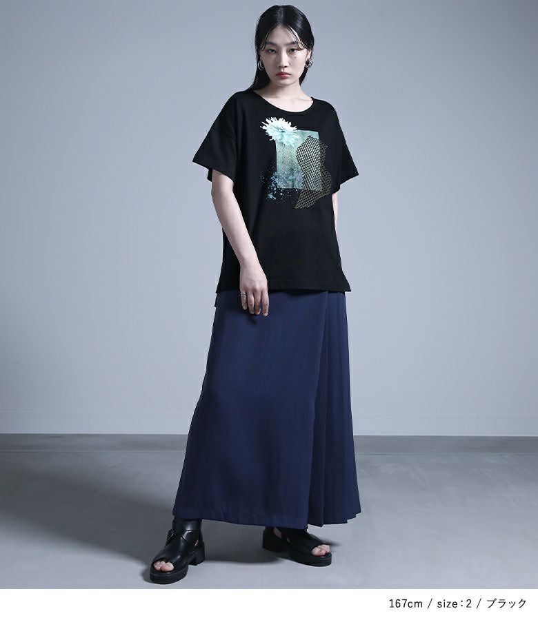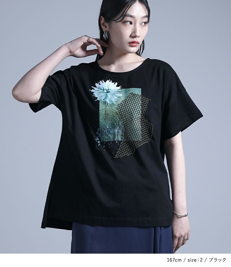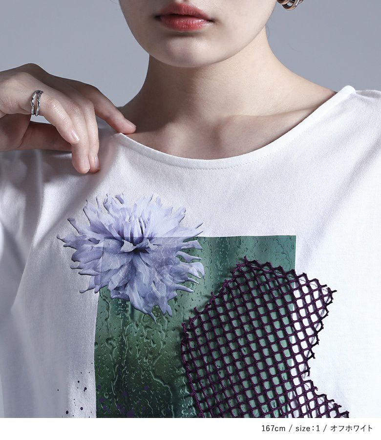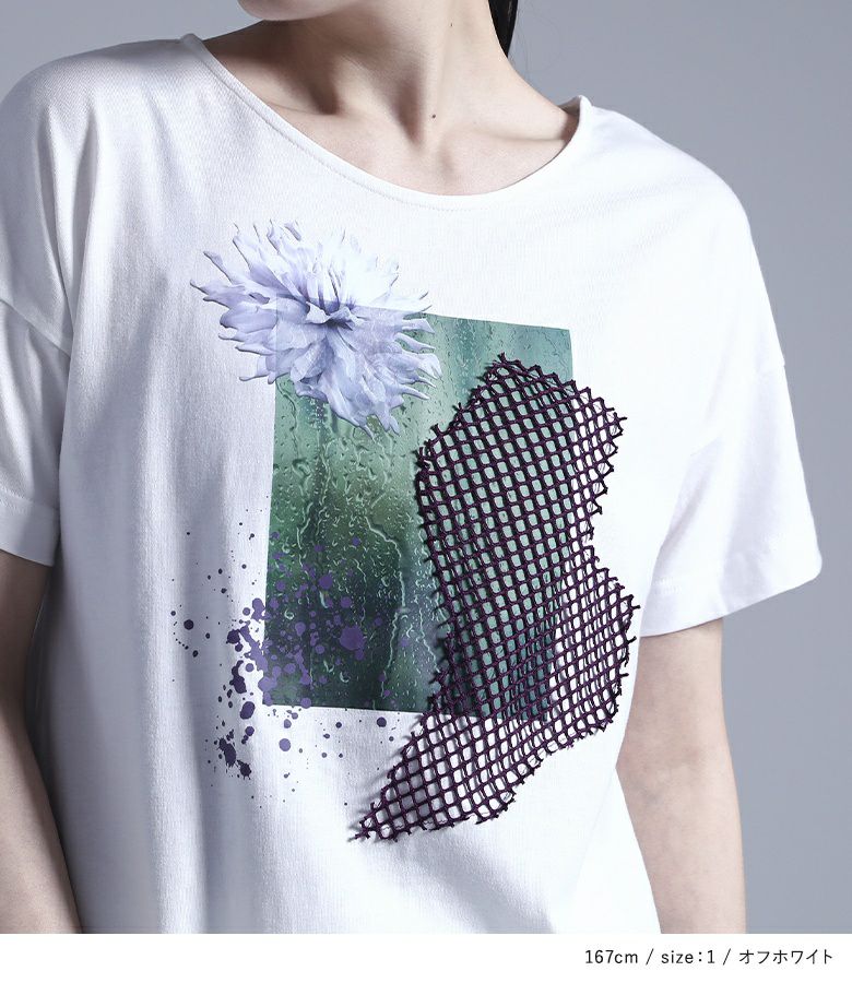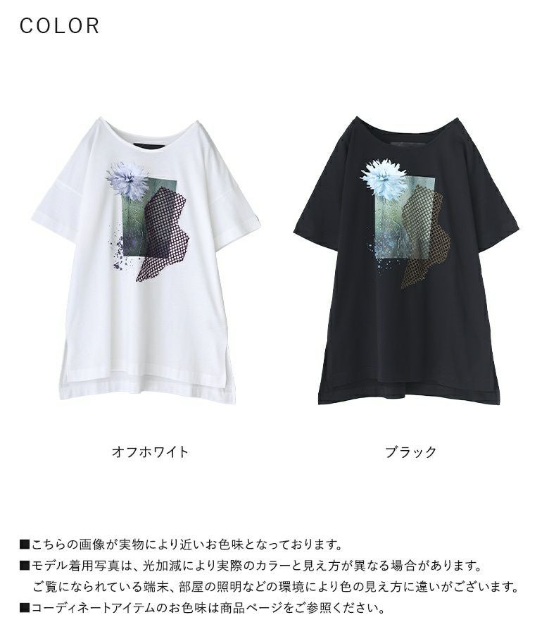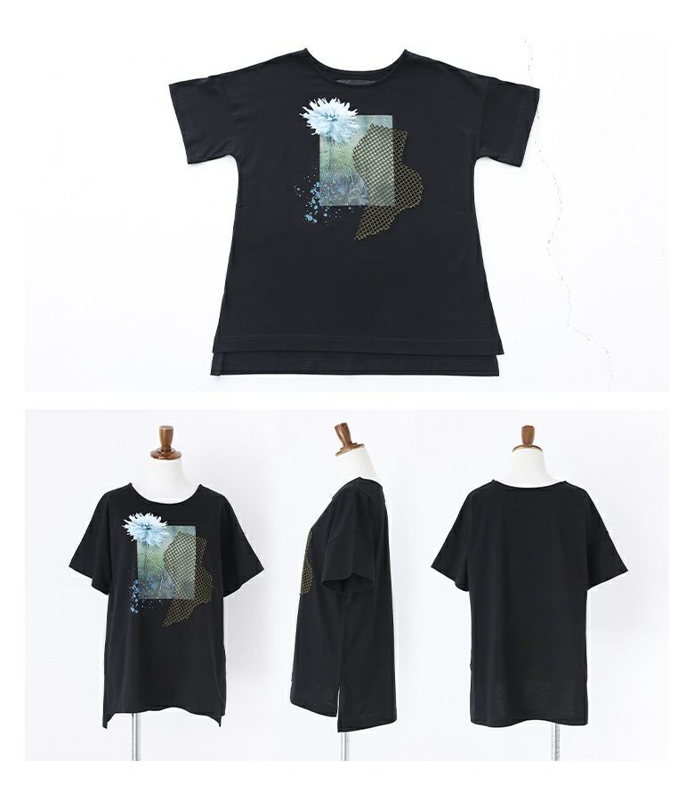 コラージュプリントの上にカットしたメッシュ生地を乗せた、ここにしかないオリジナルデザインのTシャツ。コラージュの花モチーフは透け感を出し、スパッタリングや水しぶきなどで涼しげでニュアンスのある雰囲気に。メッシュ生地はモードな印象になるように形にこだわりました。前後差のある着丈と長めのスリットで抜け感もプラスします。