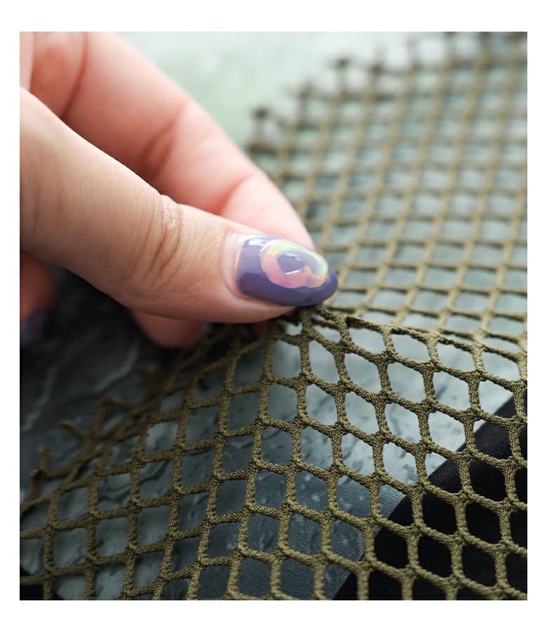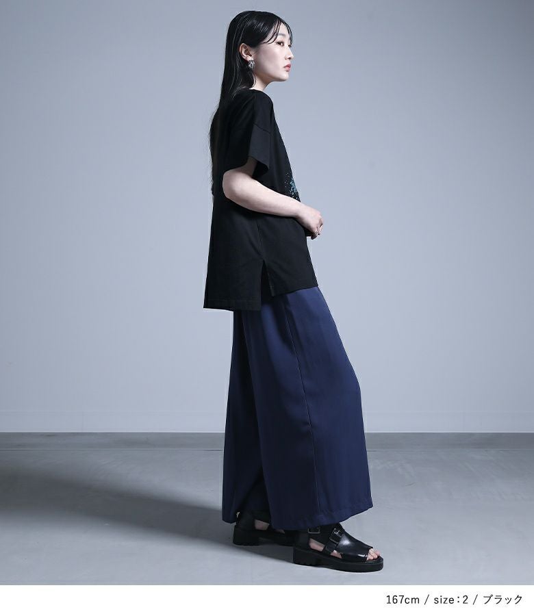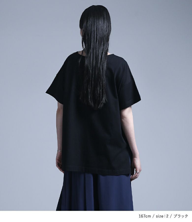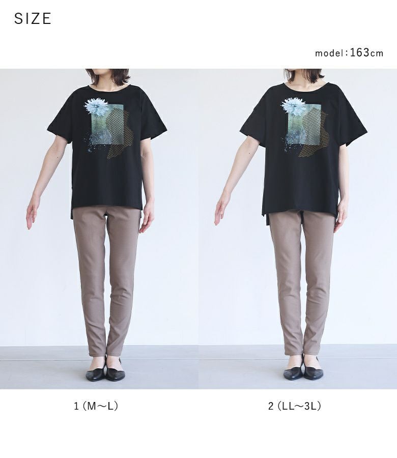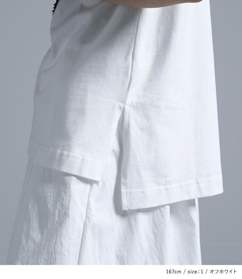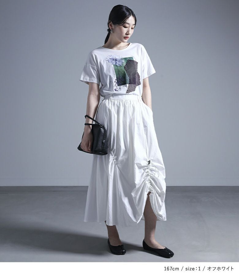 コラージュプリントの上にカットしたメッシュ生地を乗せた、ここにしかないオリジナルデザインのTシャツ。コラージュの花モチーフは透け感を出し、スパッタリングや水しぶきなどで涼しげでニュアンスのある雰囲気に。メッシュ生地はモードな印象になるように形にこだわりました。前後差のある着丈と長めのスリットで抜け感もプラスします。