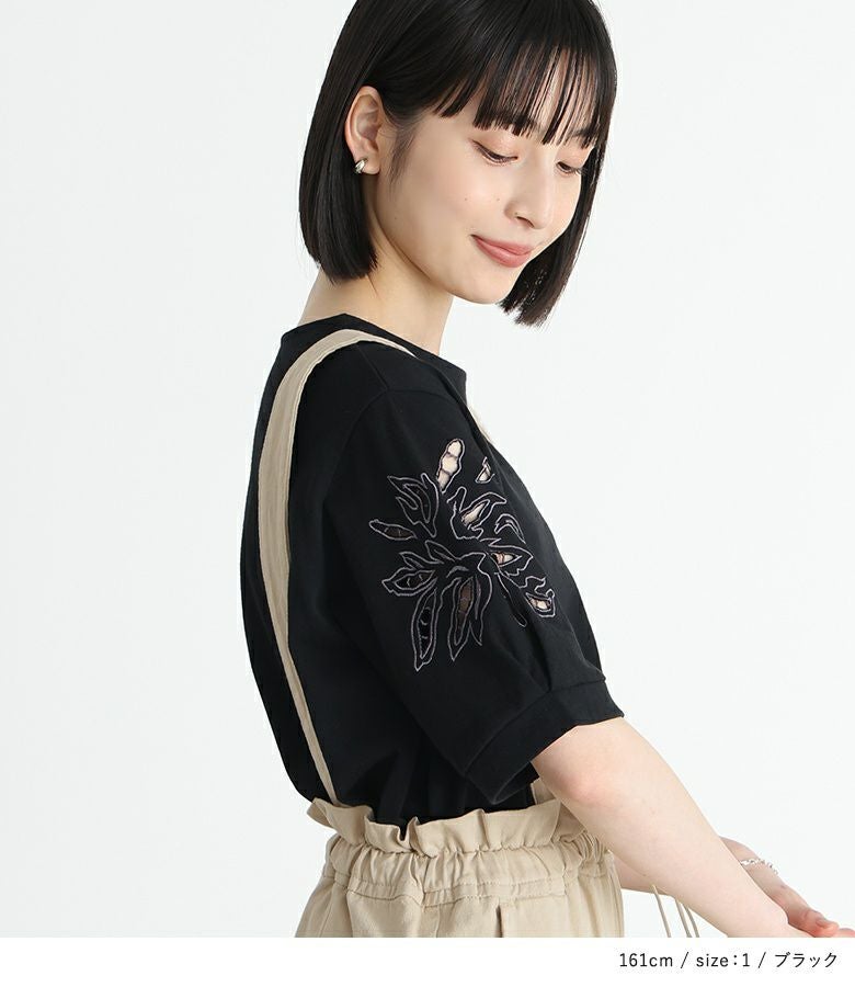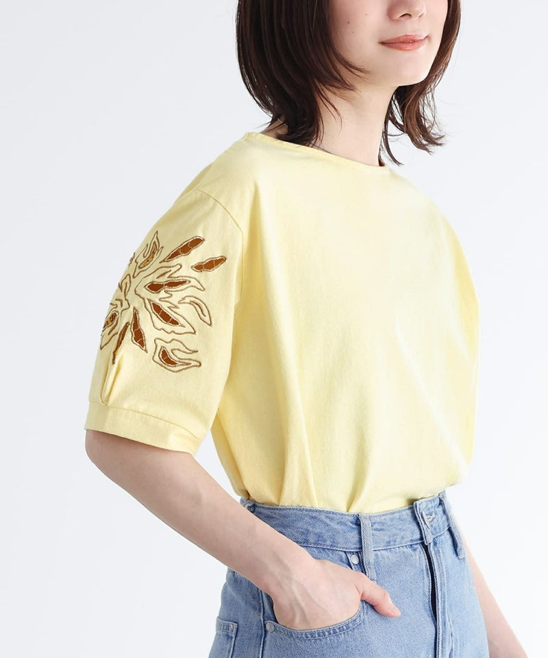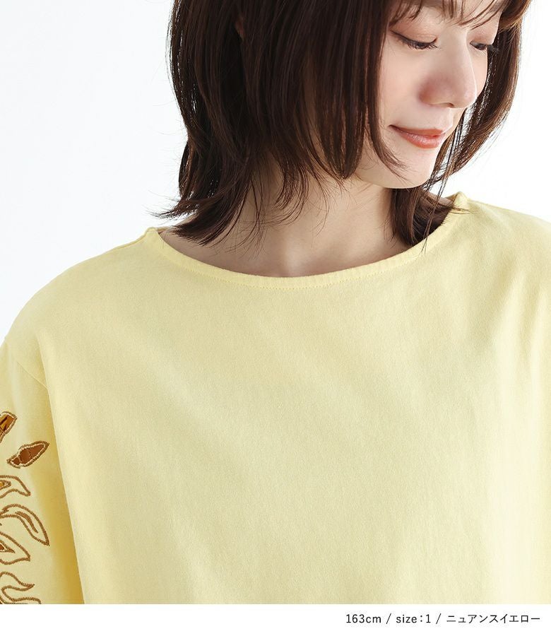 袖にオリジナルの刺繍を施した袖カットTシャツ。同系の配色で主張し過ぎず、フラワーモチーフのような抽象的なデザインで、可愛くなり過ぎず大人っぽい印象に仕上げました。ぽわんとした袖が女性らしい一枚です。開き過ぎないボートネック&襟ぐりは裏バインダー始末ですっきりとした見た目に。