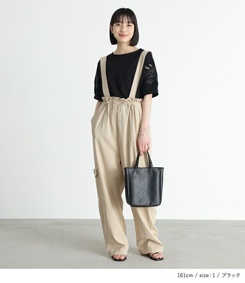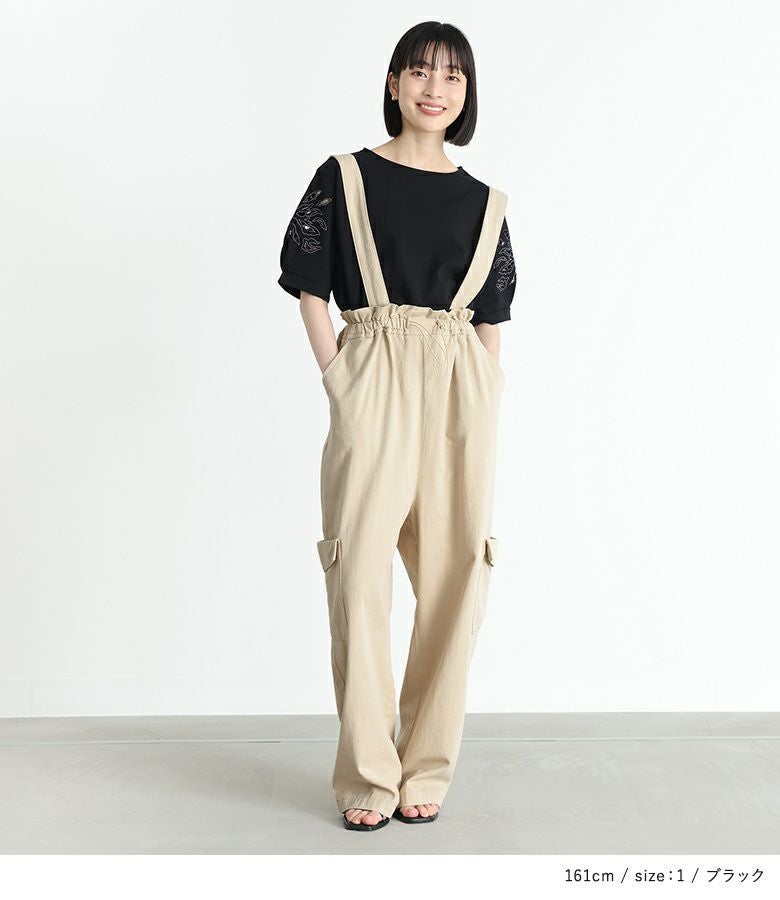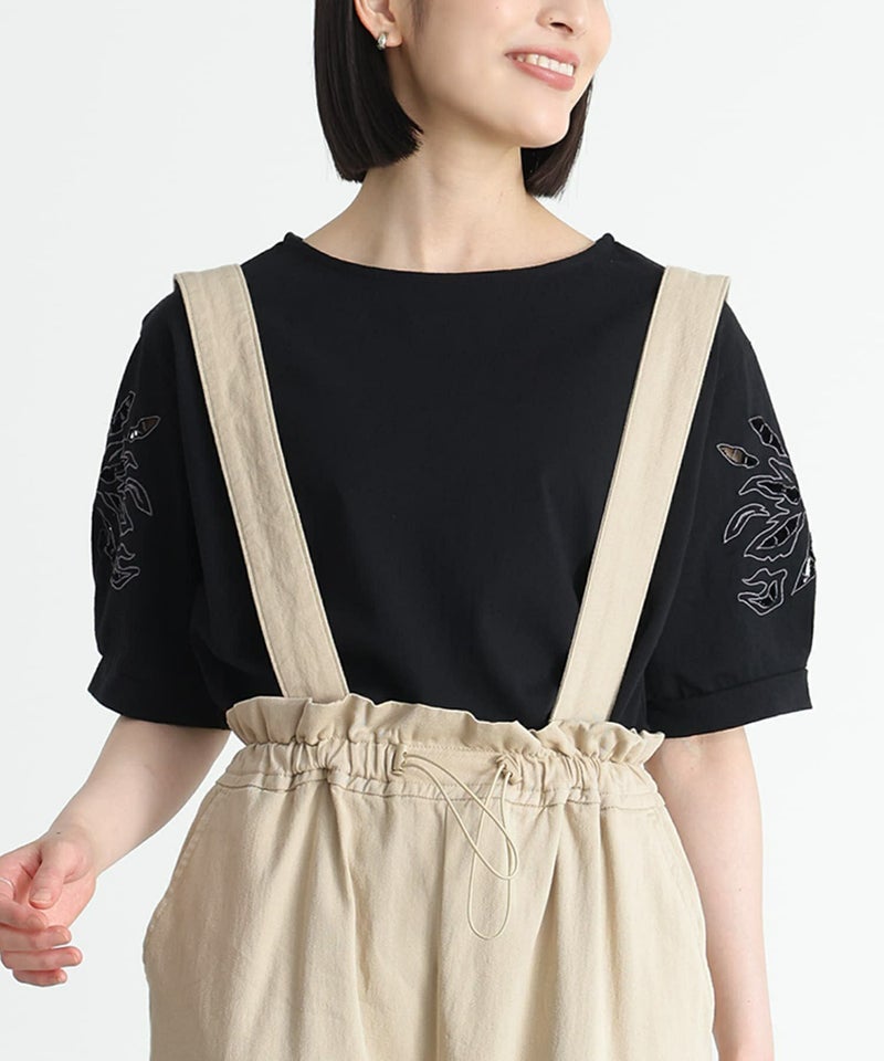 袖にデザインがあるアイテムなので、裾をインしてもお洒落にご着用いただけます。サロペットと合わせても袖の刺がポイントに。