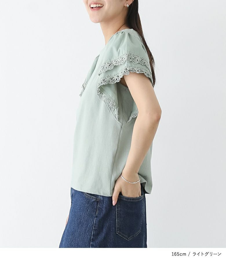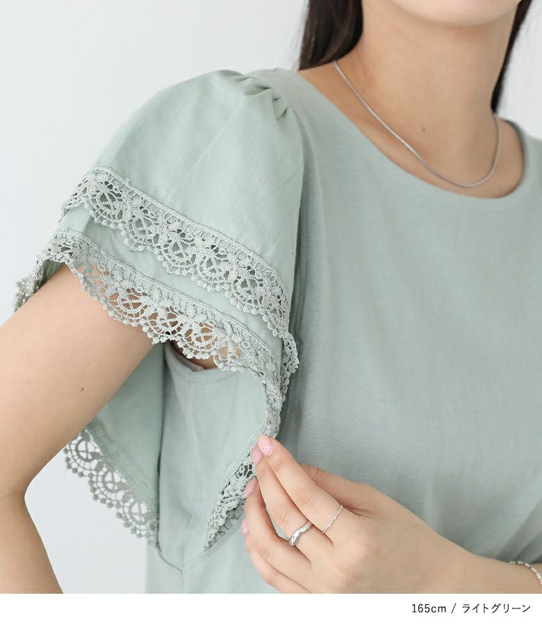 二重仕立ての袖レースが程よく華やかで大人かわいい印象をプラスするプルオーバー。