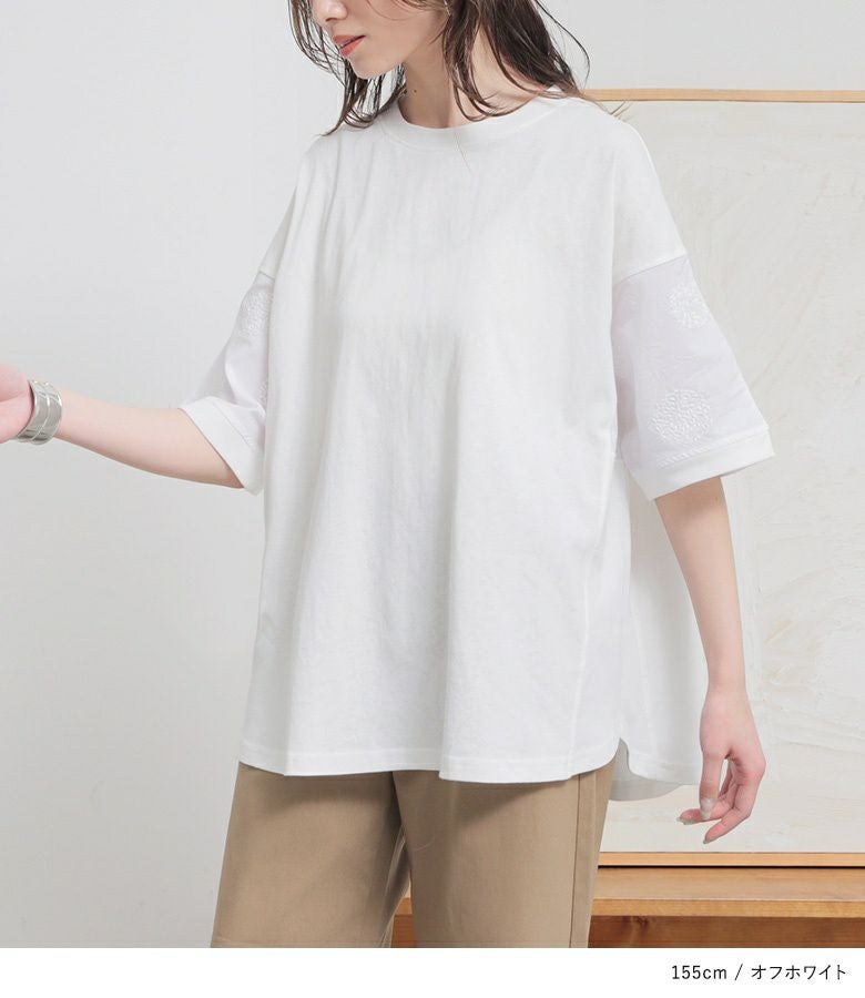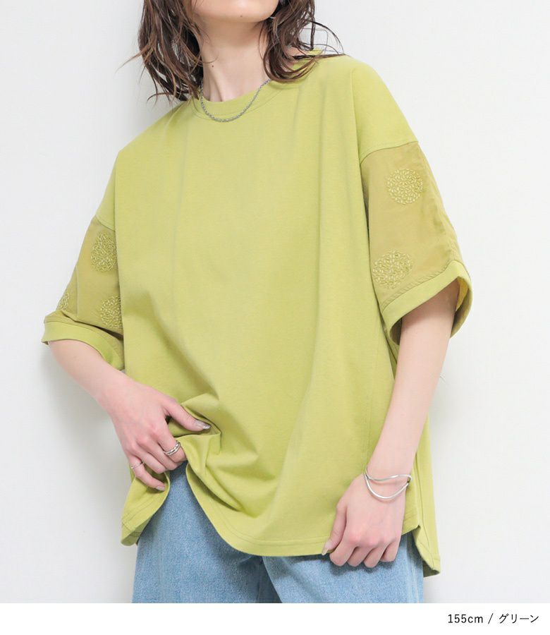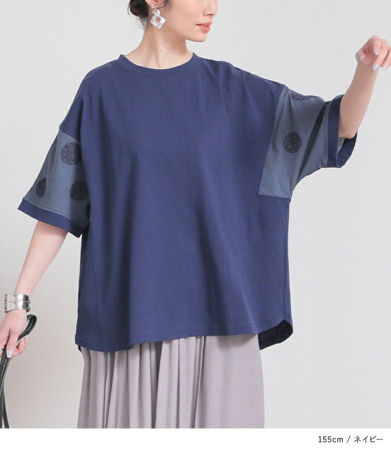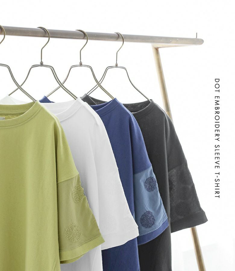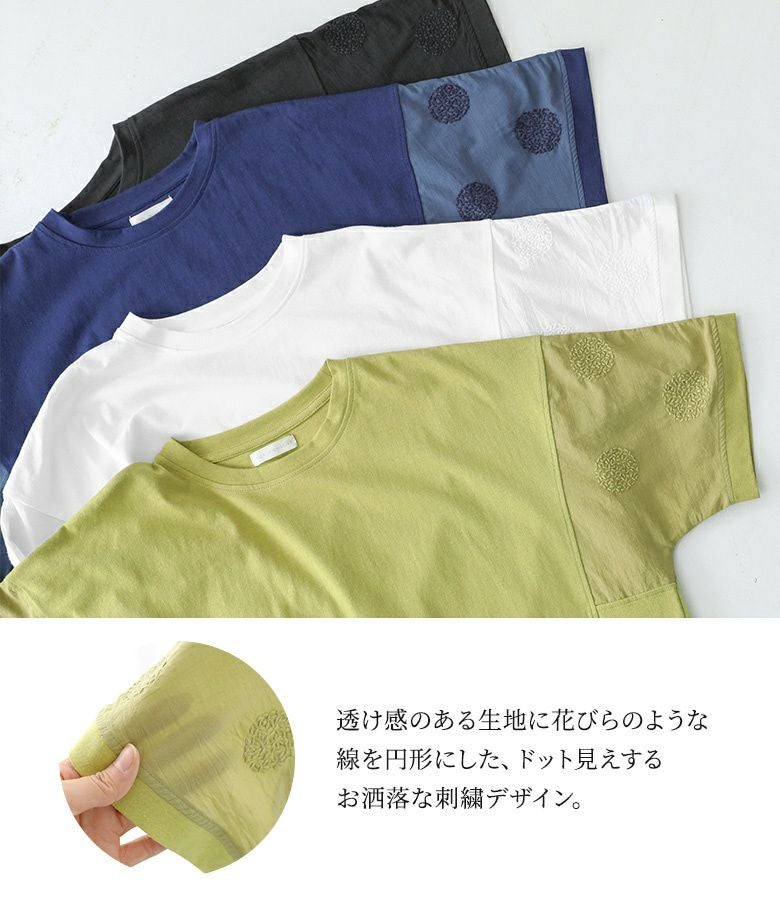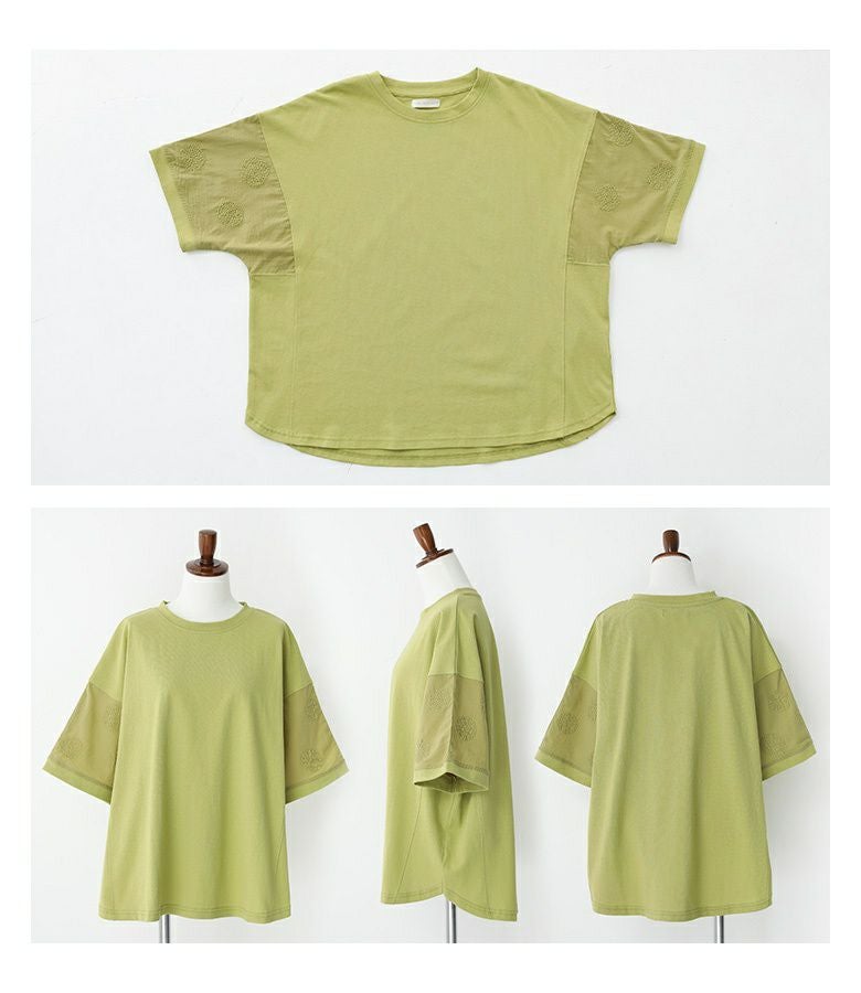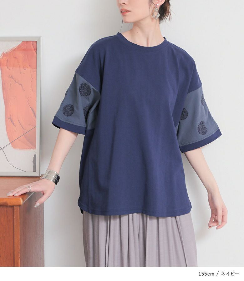 『袖ドット刺繍異素材切替Tシャツ』