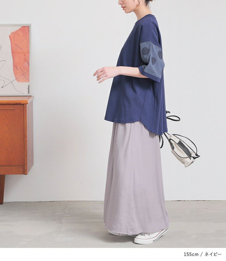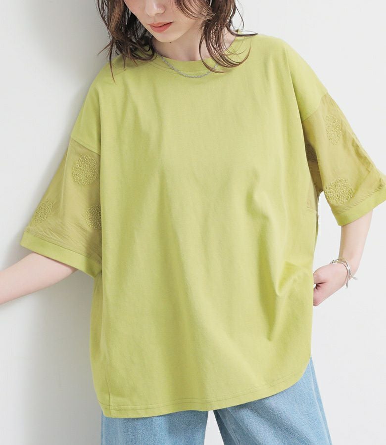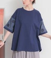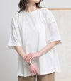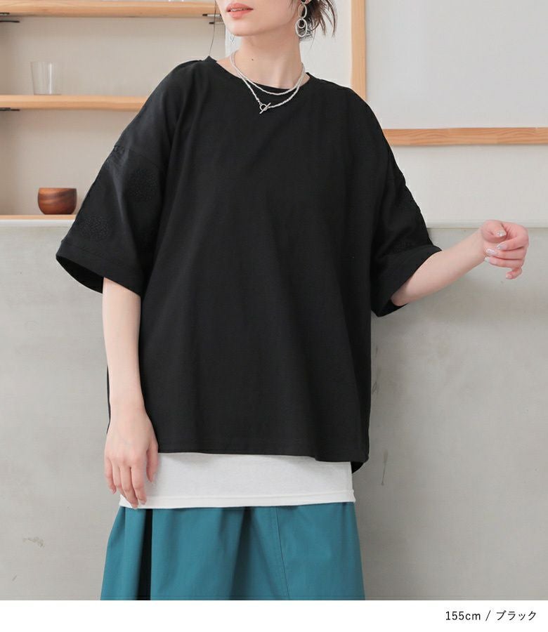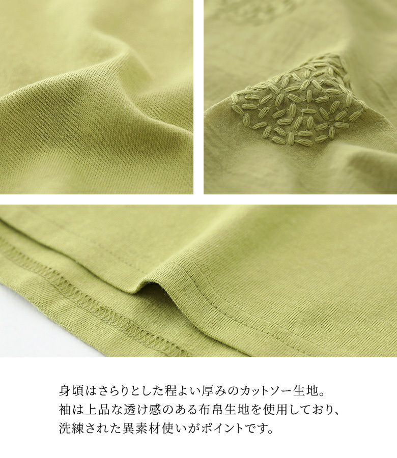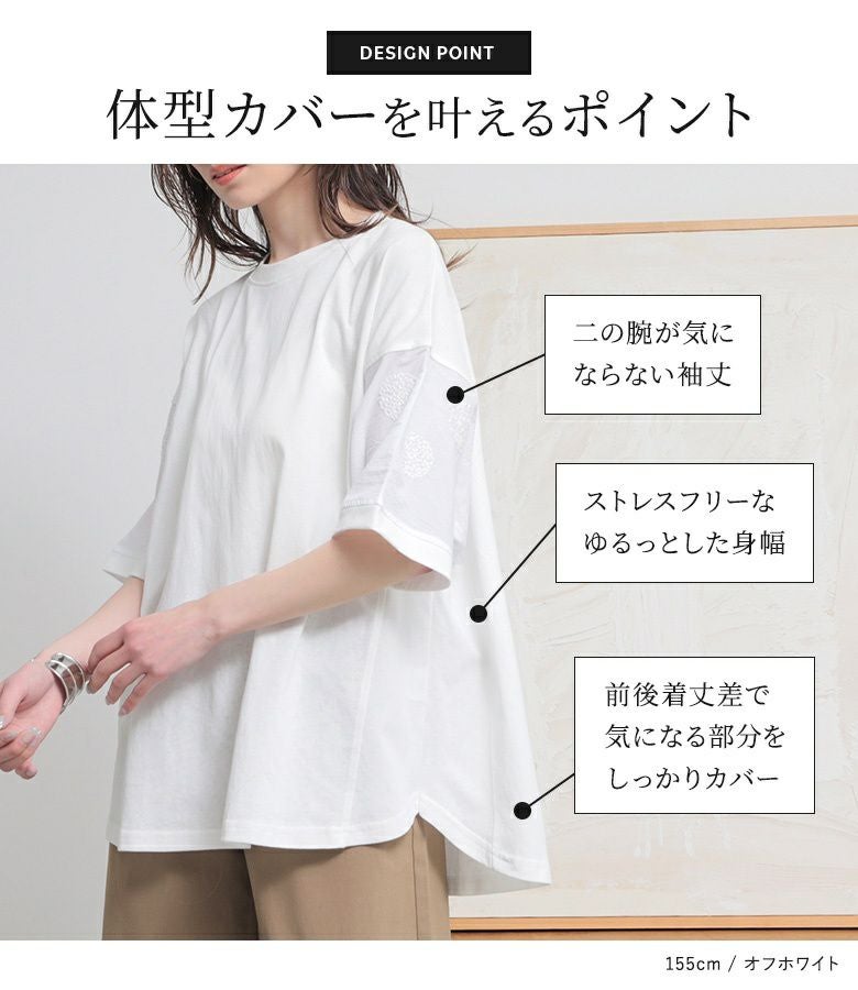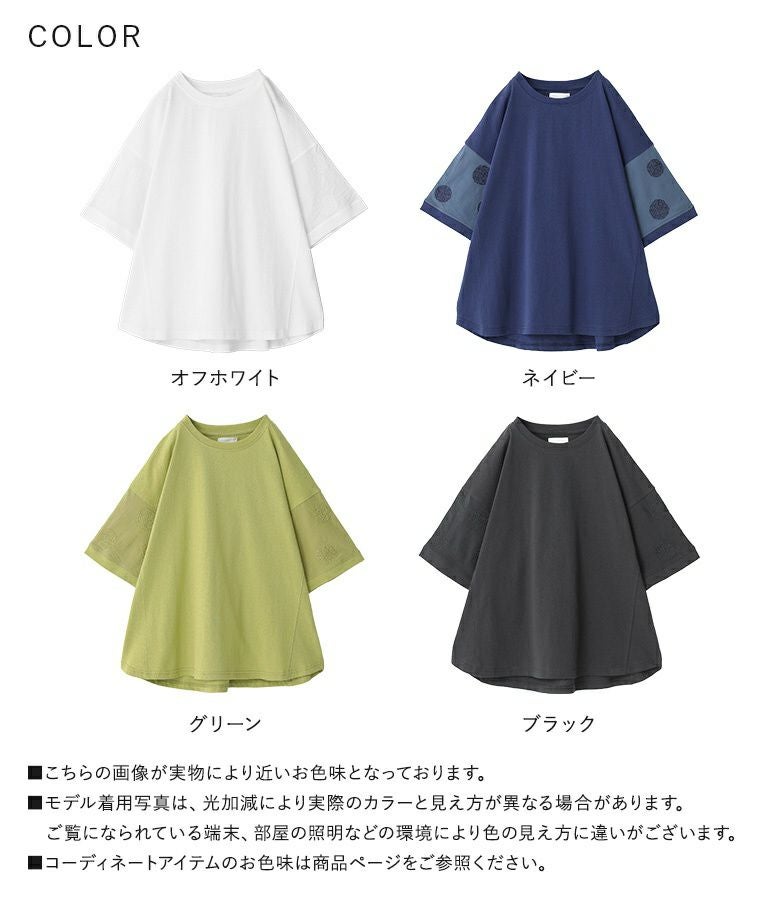 『袖ドット刺繍異素材切替Tシャツ』
