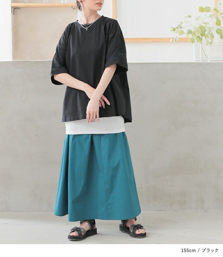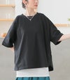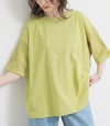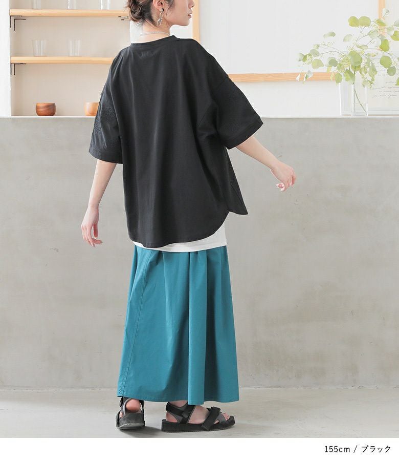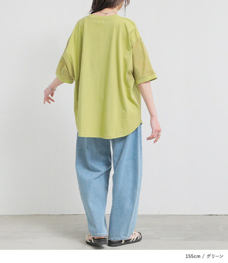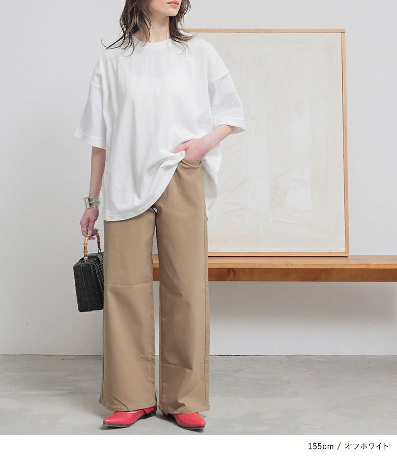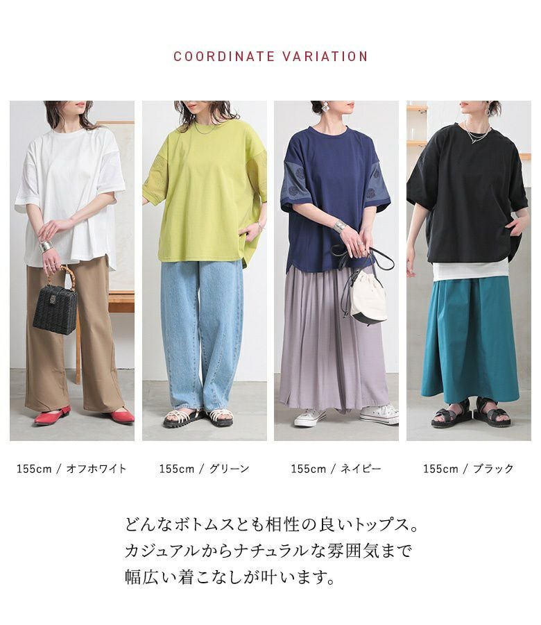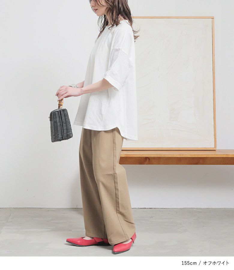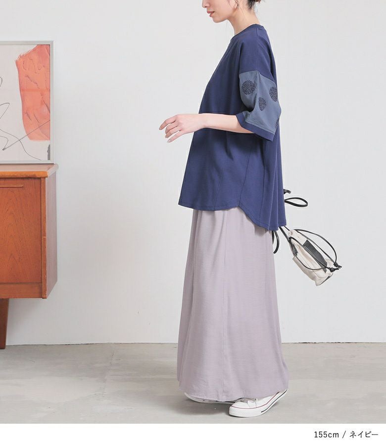 『袖ドット刺繍異素材切替Tシャツ』