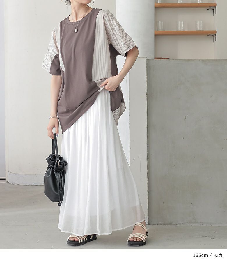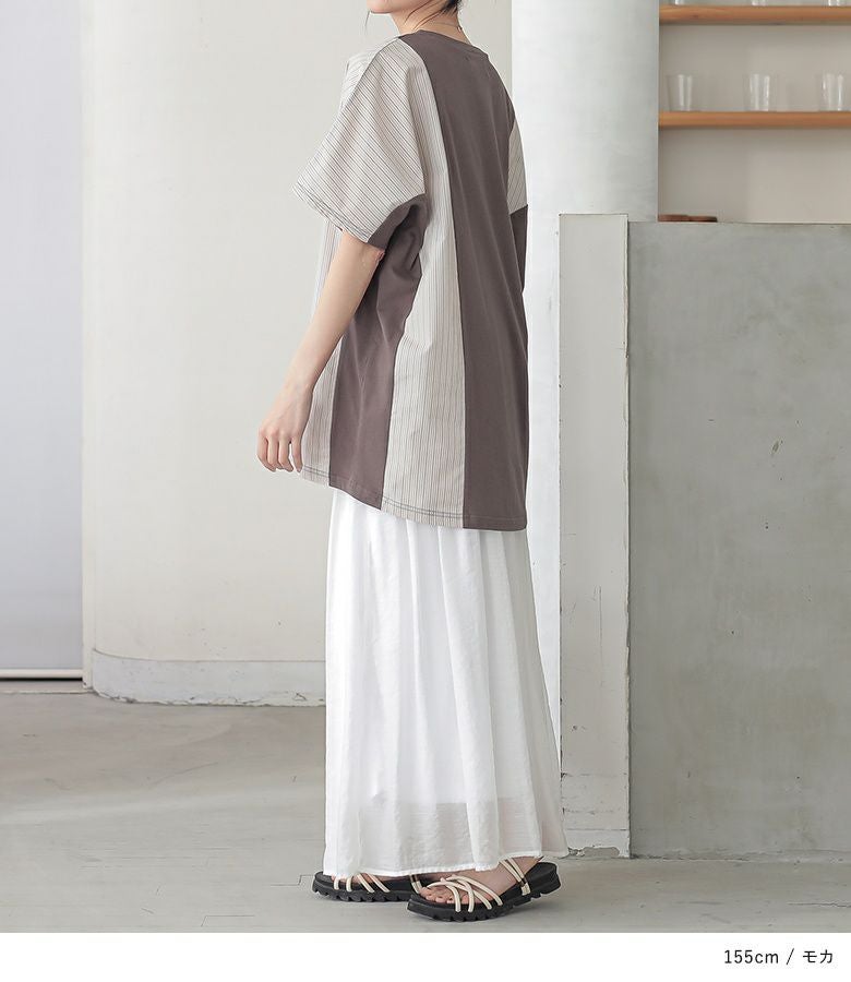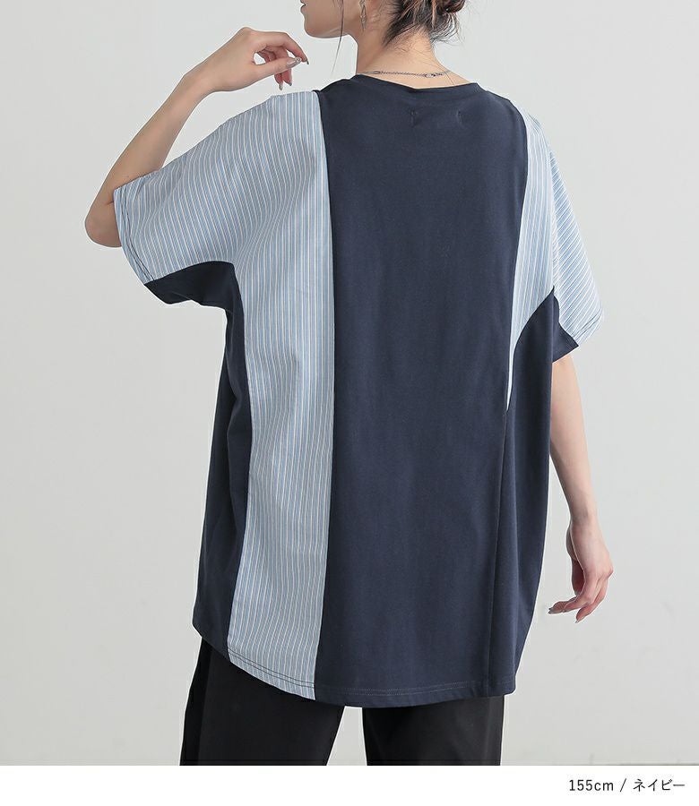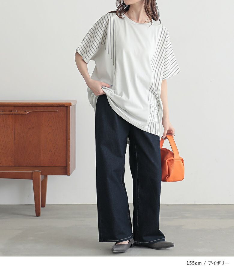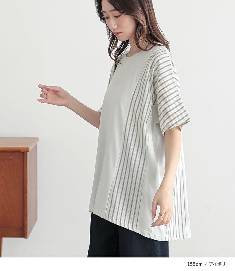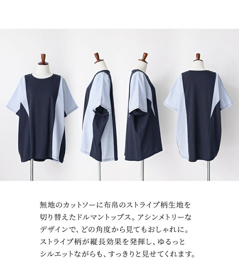 無地×ストライプ柄で切り替えたドルマンカットソー。