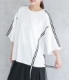 ラインテープデザインでこなれ感を演出するTシャツ。ゆるっとしたサイズ感と二の腕が隠れる袖丈で体型カバーが叶うのも嬉しいポイントです。