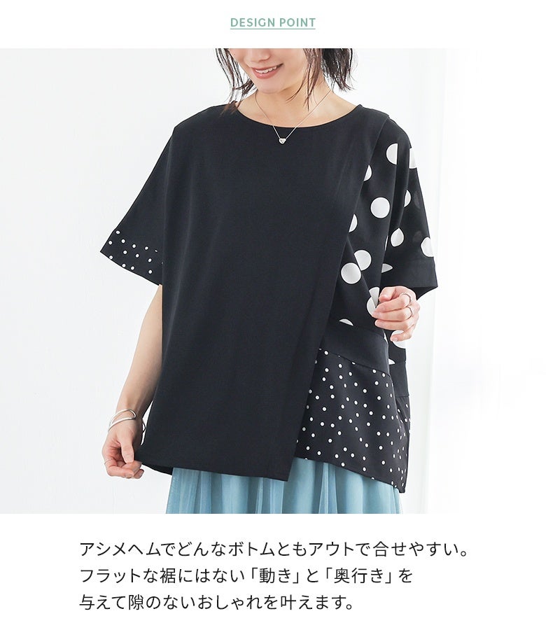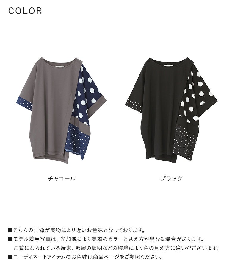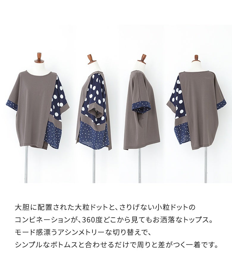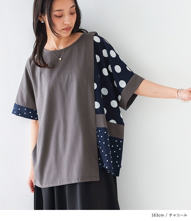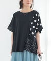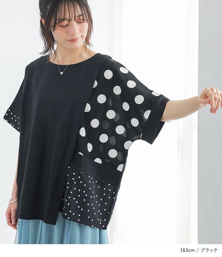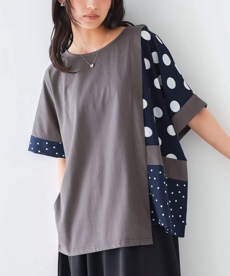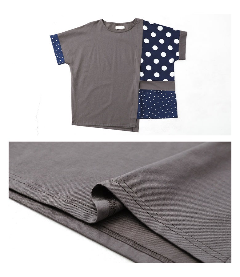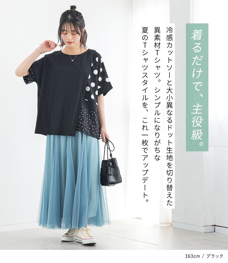 冷感カットソー×ドット柄生地を切り替えた異素材Tシャツ。