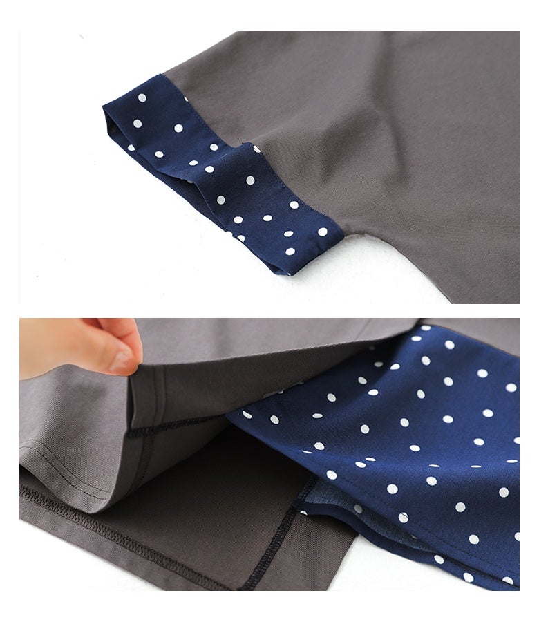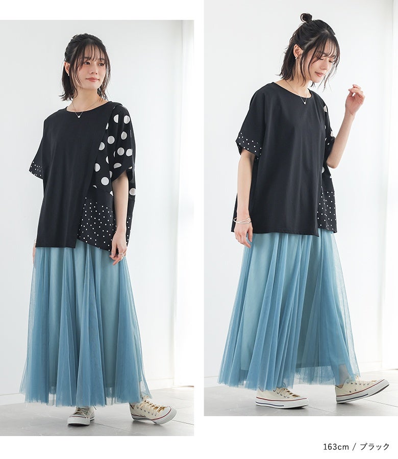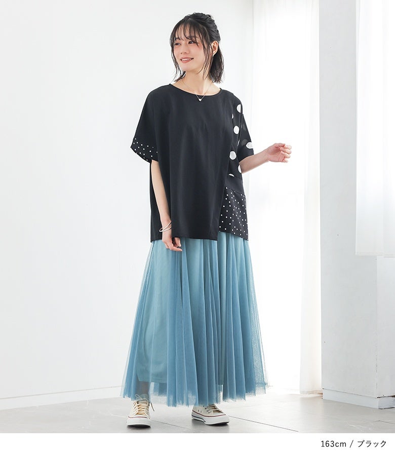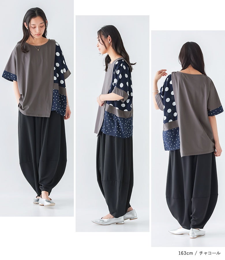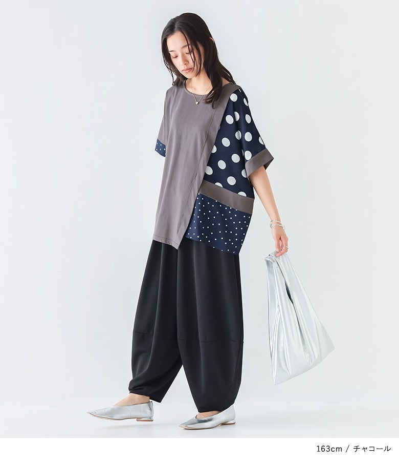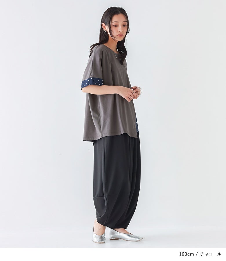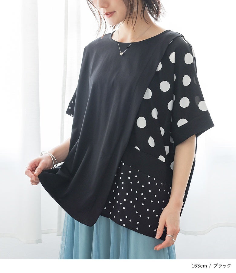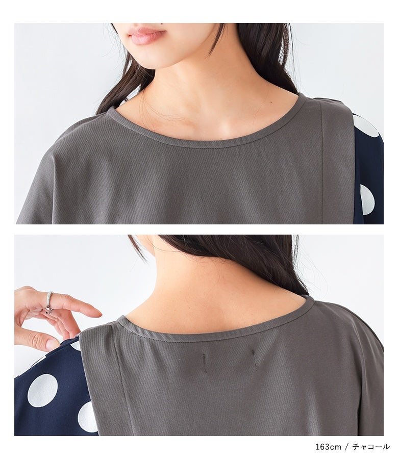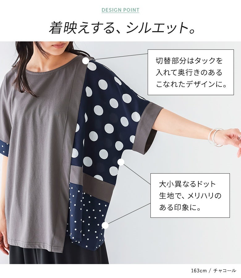 冷感カットソー×ドット柄生地を切り替えた異素材Tシャツ。