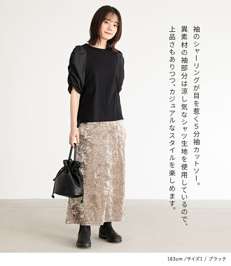 【普段着用】 Tops: M Bottoms: M | 【1】 袖丈:ちょうどひじ位 着丈:ヒップ真ん中位 腕周り:ややゆったり バスト:ジャスト 全体:スッキリ