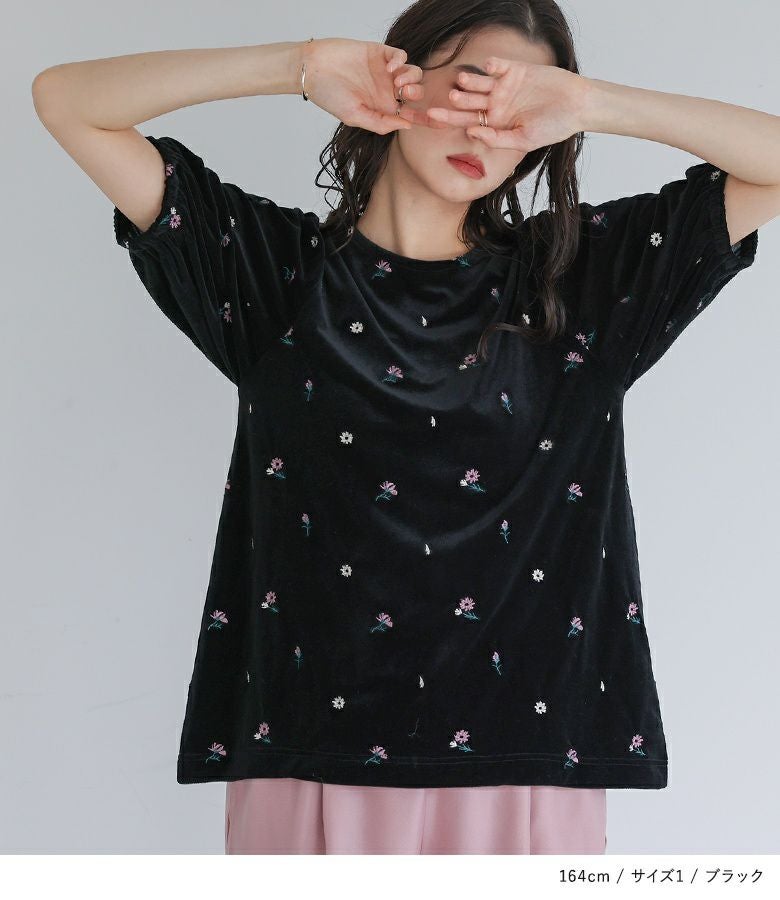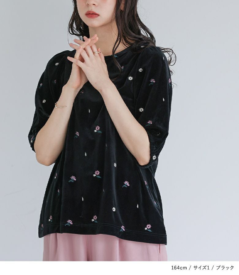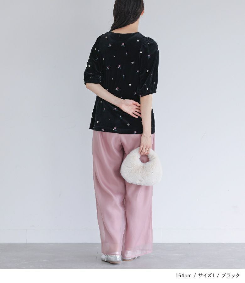 【普段着用】 Tops: M Bottoms: M/L | 【1】 袖丈:ちょうどひじ位 着丈:ヒップ真ん中より下位 腕周り:ややゆったり バスト:ゆったり 全体:ゆったり