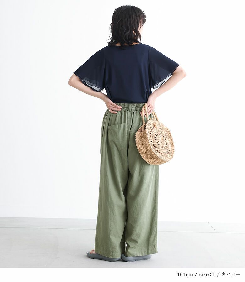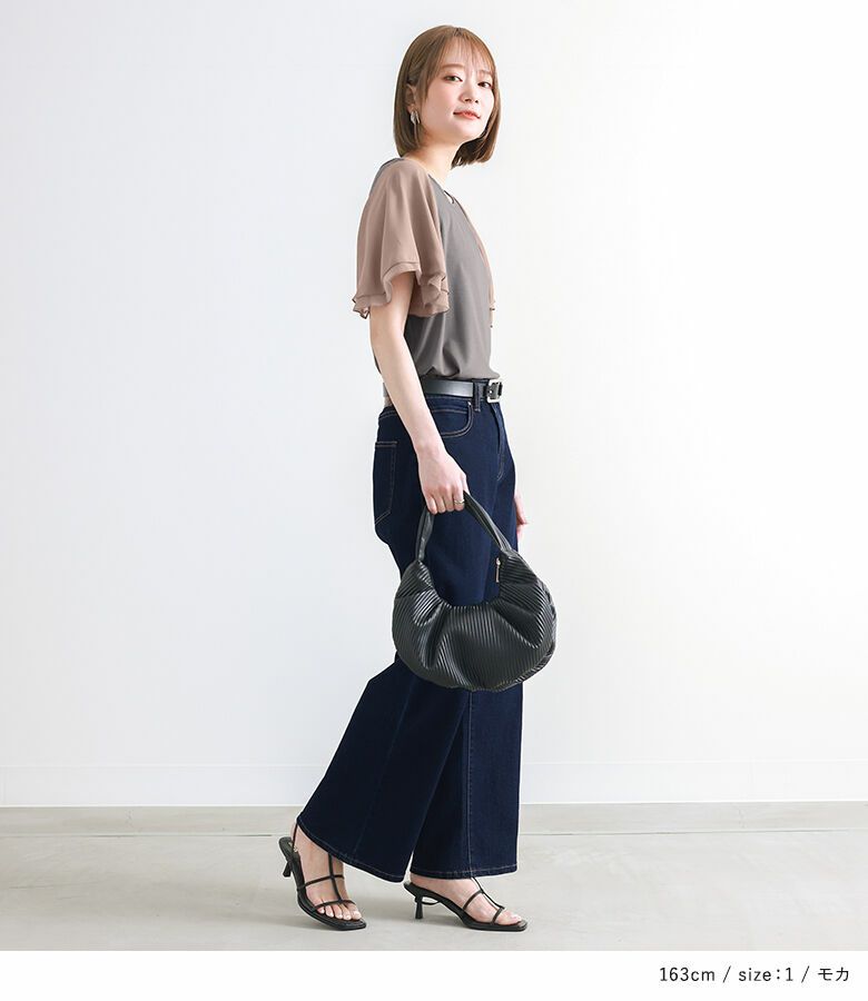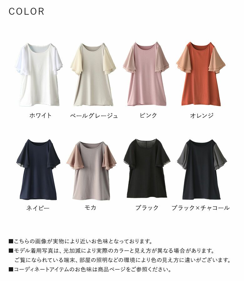 さらりと柔らかく落ち感のある綺麗めのカットソー素材と、軽やかなシフォン素材の組み合わせ。暑い時期も心地よく着用できます。