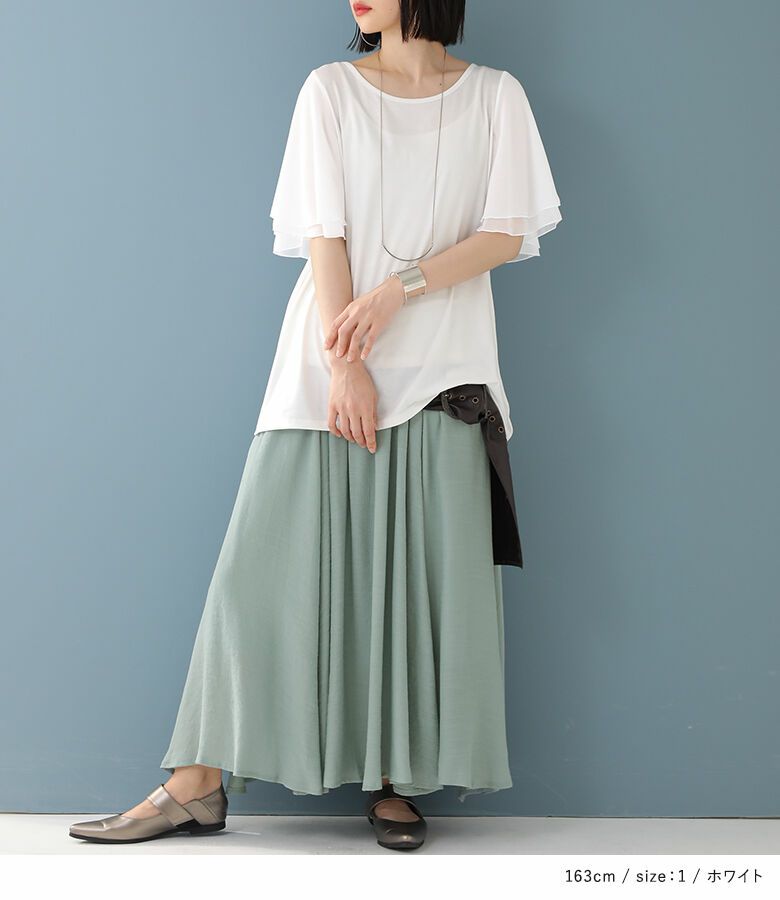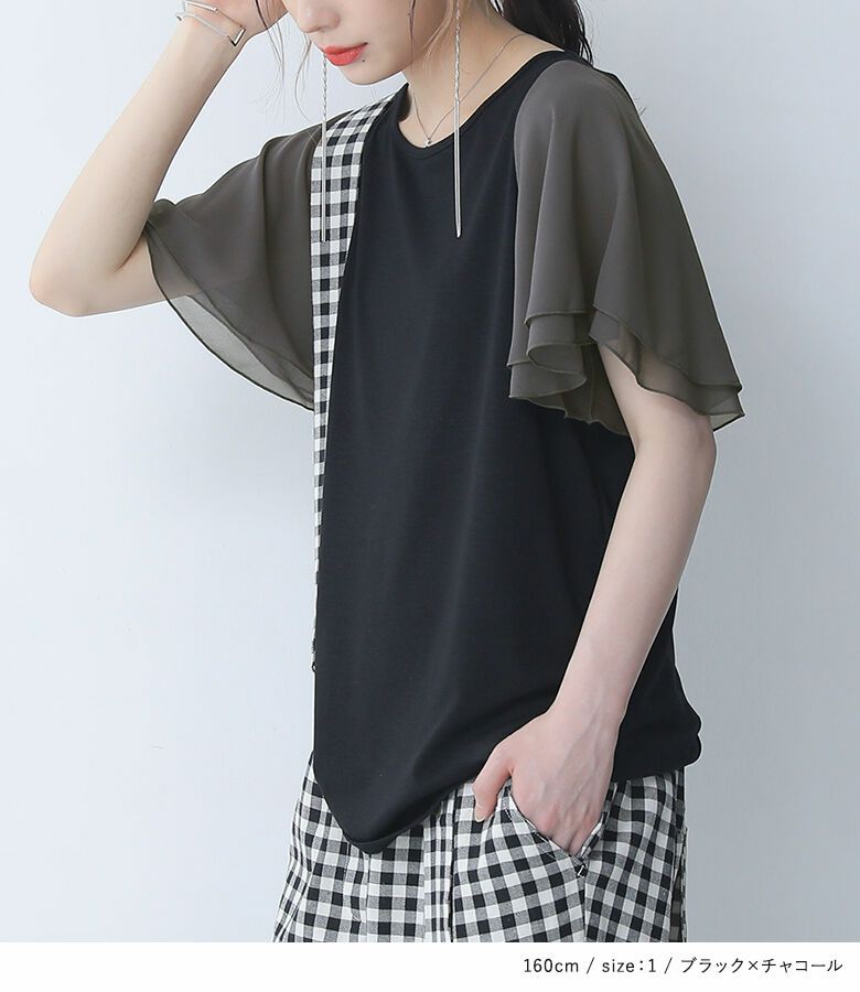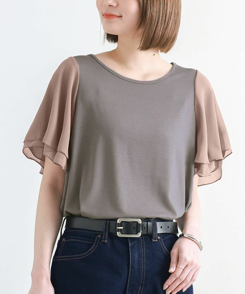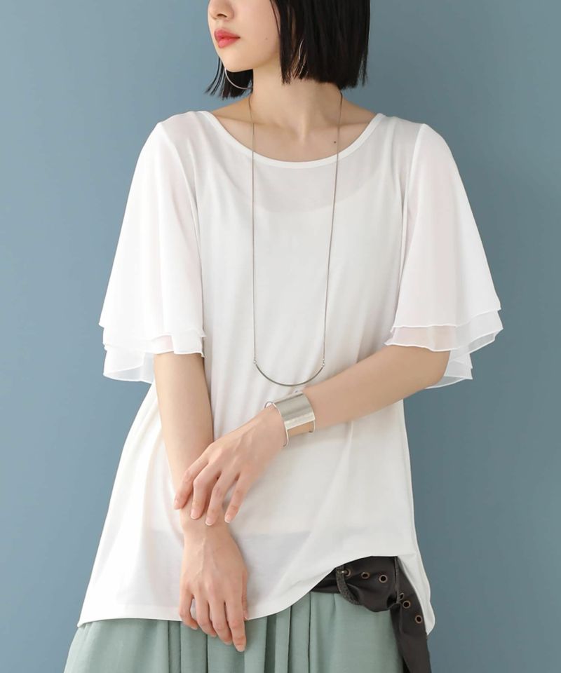 二重に重ねたシフォンのフレアスリーブが魅力のデザインTシャツ。動くたびに揺れるシフォン袖が涼やかで、気になる二の腕もカバーします。