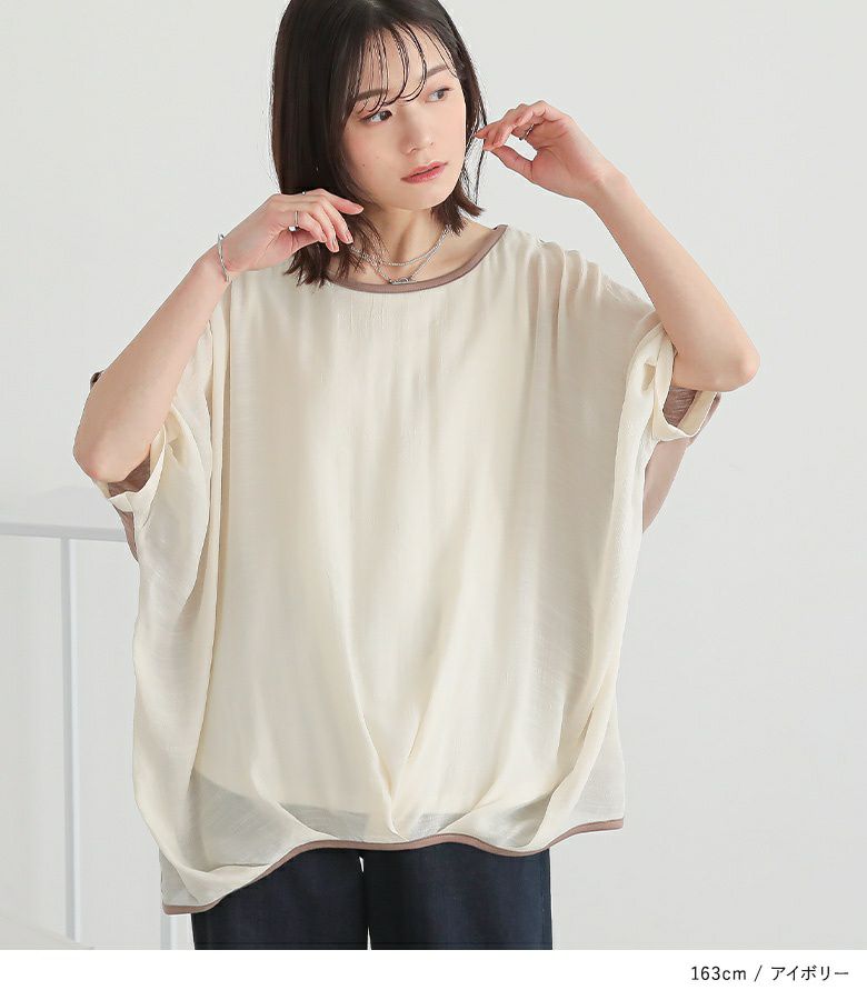 風合いと落ち感のあるブラウス生地と、肌ざわりの良いカットソー生地の異素材使いが大人の品格を醸し出します。