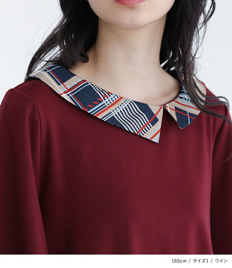センスと女性らしさを醸し出す、アシメ襟と2枚仕立てのひらり袖。レトロなチェック柄の異素材デザインが、個性的で立体感のあるフォルムを創りだします。