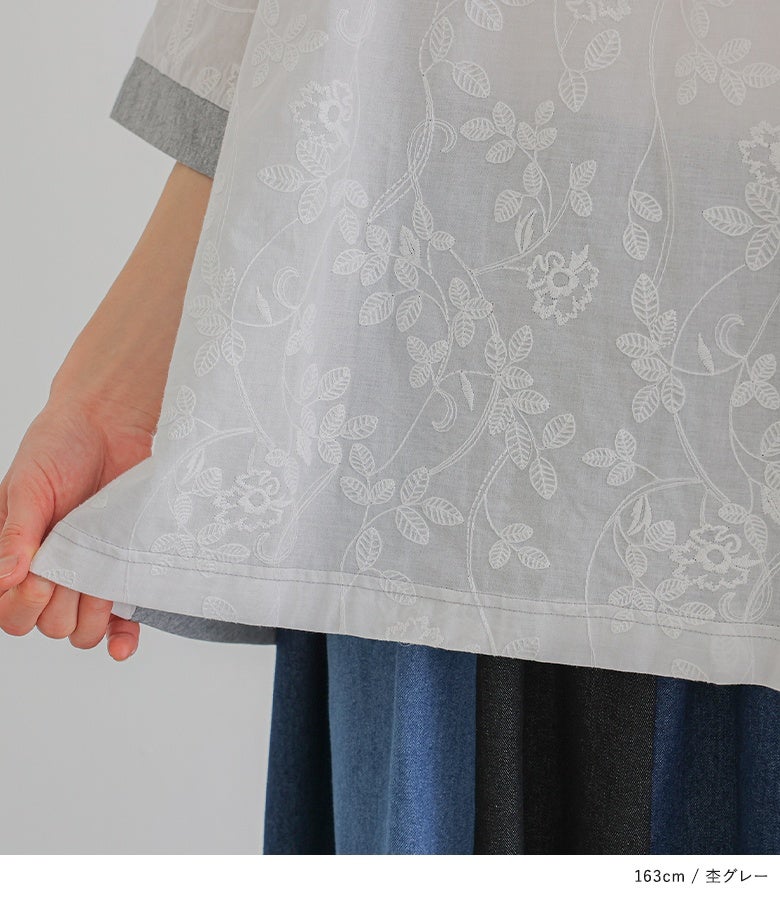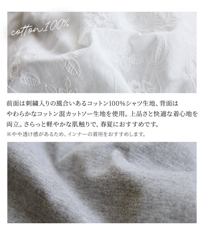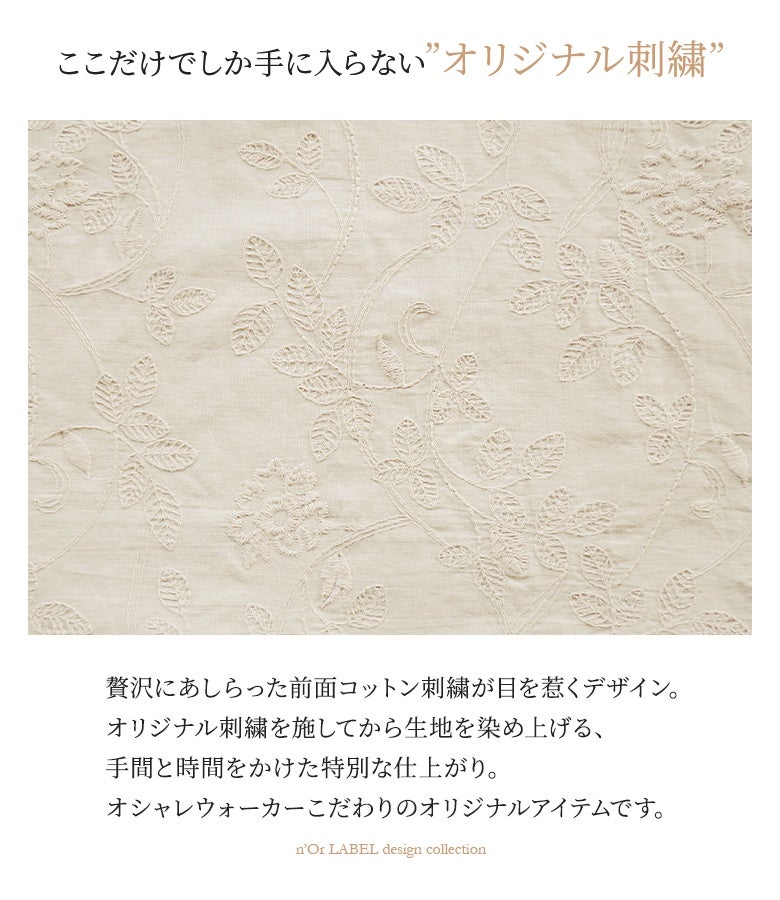 優しさと上品さ漂うコットン刺繍が全面に施され、その後に生地を染め上げるなど手間と時間をかけてこだわり抜いた一着。