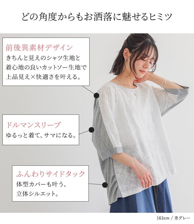 きちんと見えシャツ生地×着心地抜群カットソー生地を使用した前後異素材デザインや、ゆるっと着心地が楽なドルマンスリーブなど、どの角度から見てもお洒落に魅せられる。