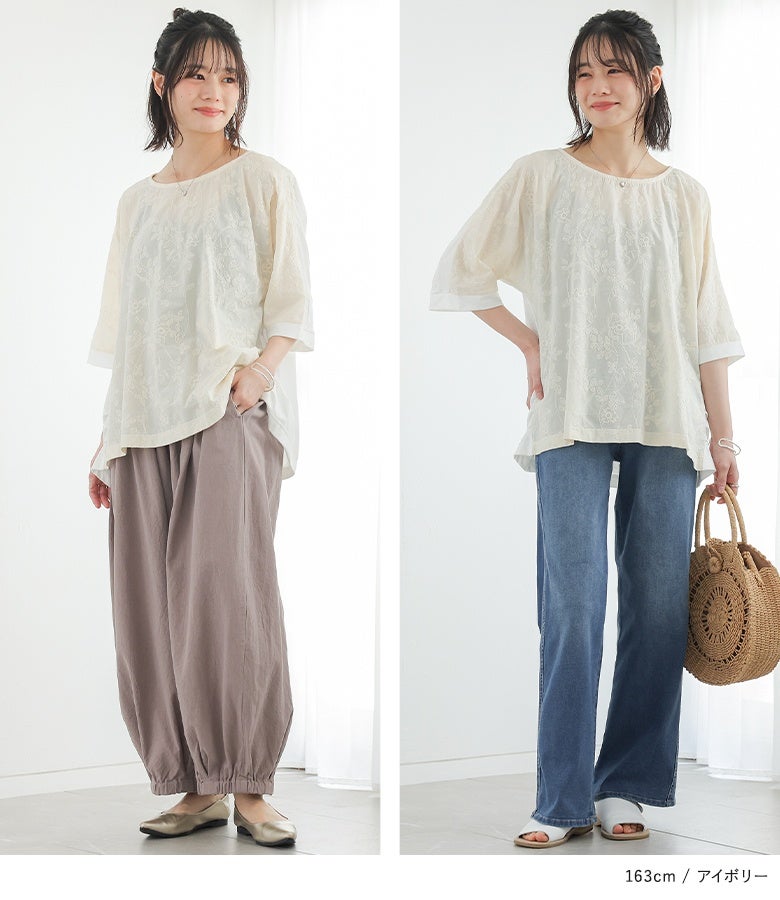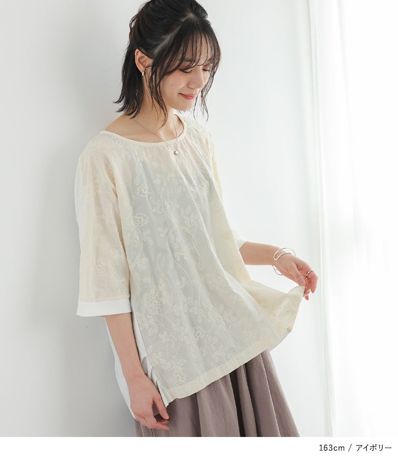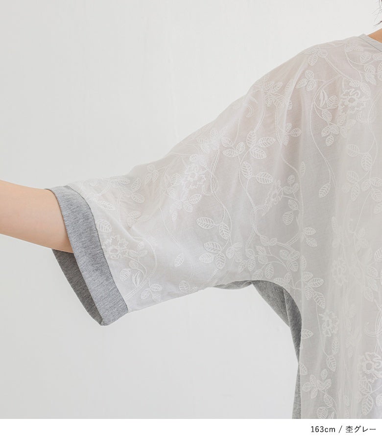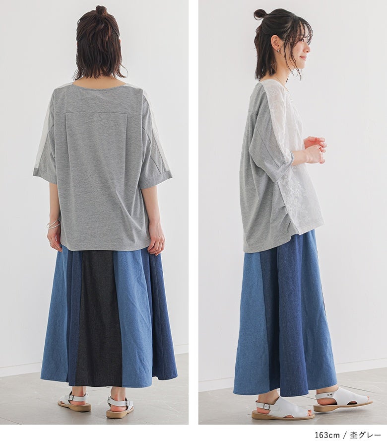 前身頃のレース地はあまり着た事がなかったのですが、涼しげでかわいいデザインてす。 丈が長めなので、パンツの透け感が心配な時は助かってます。