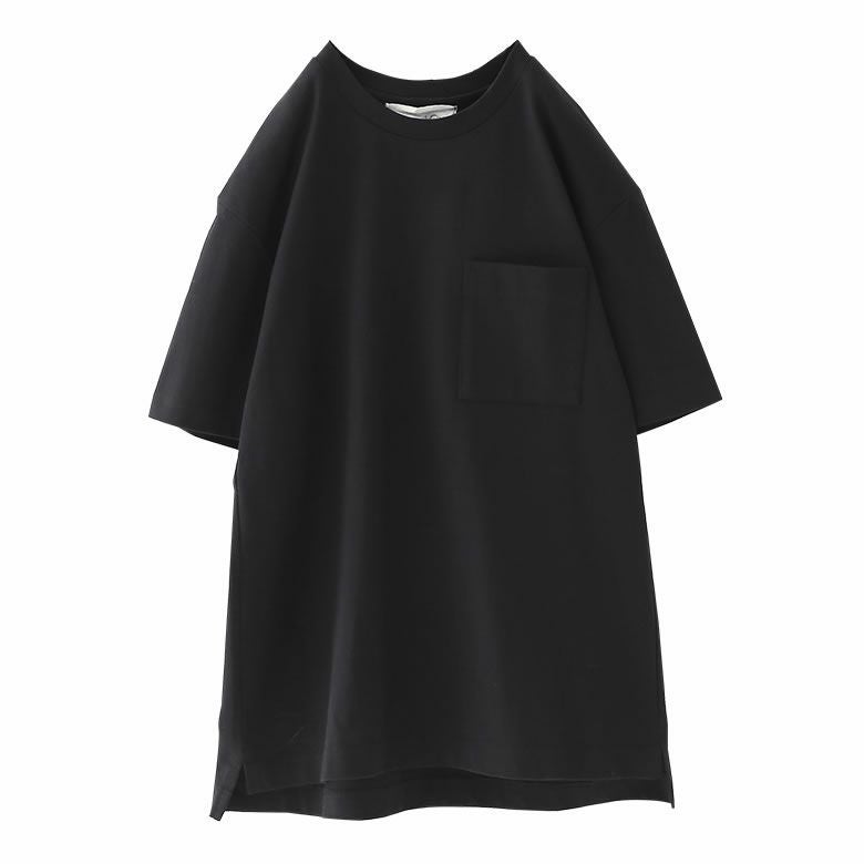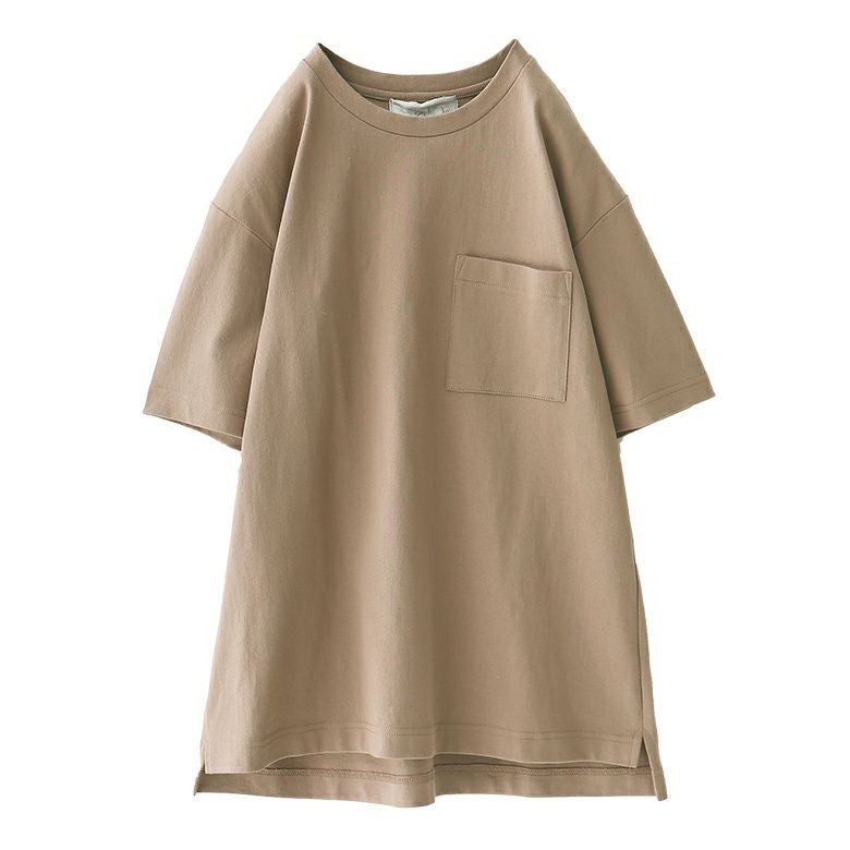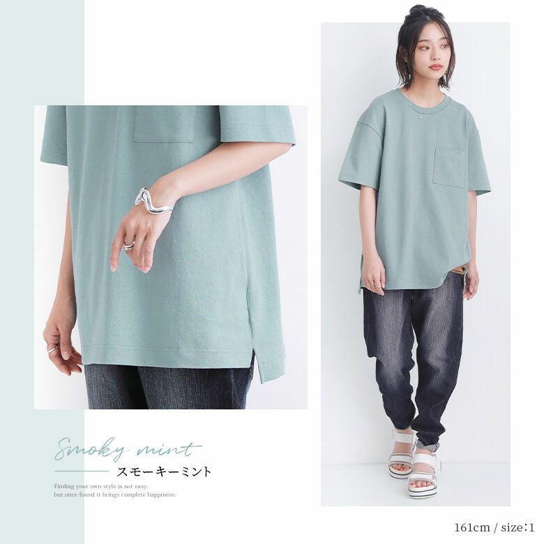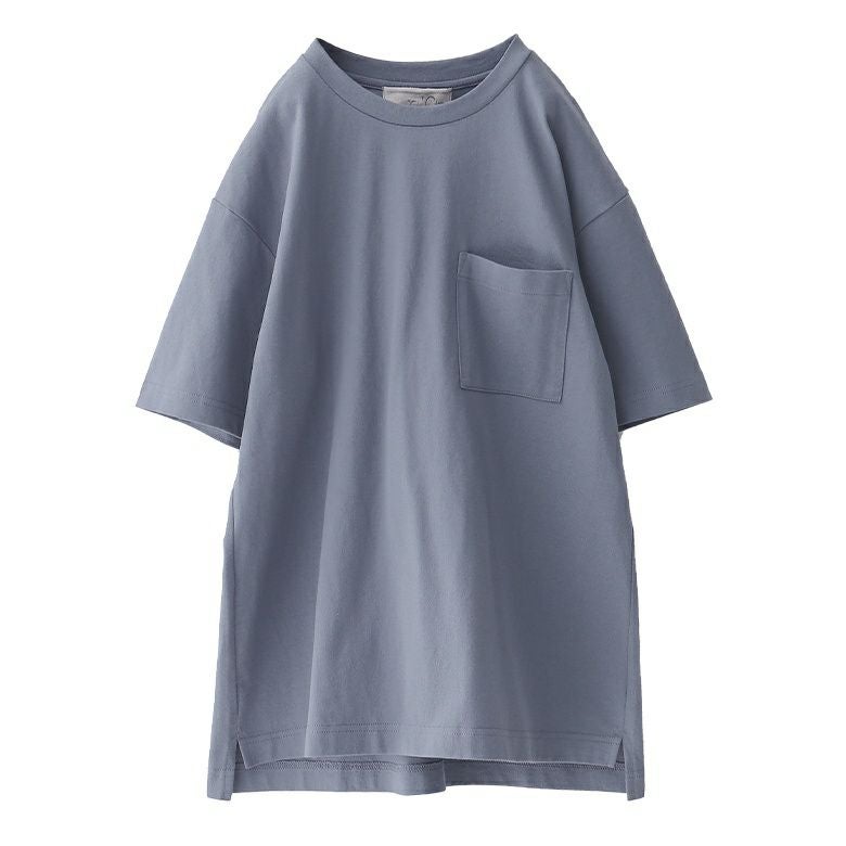 少し前後差をつけた長め丈とスリットの入ったデザインは、動くときにストレスを感じないこだわり仕様。胸元の大きめポケットがアクセントになり、シンプルながらもこなれ感を演出してくれます。