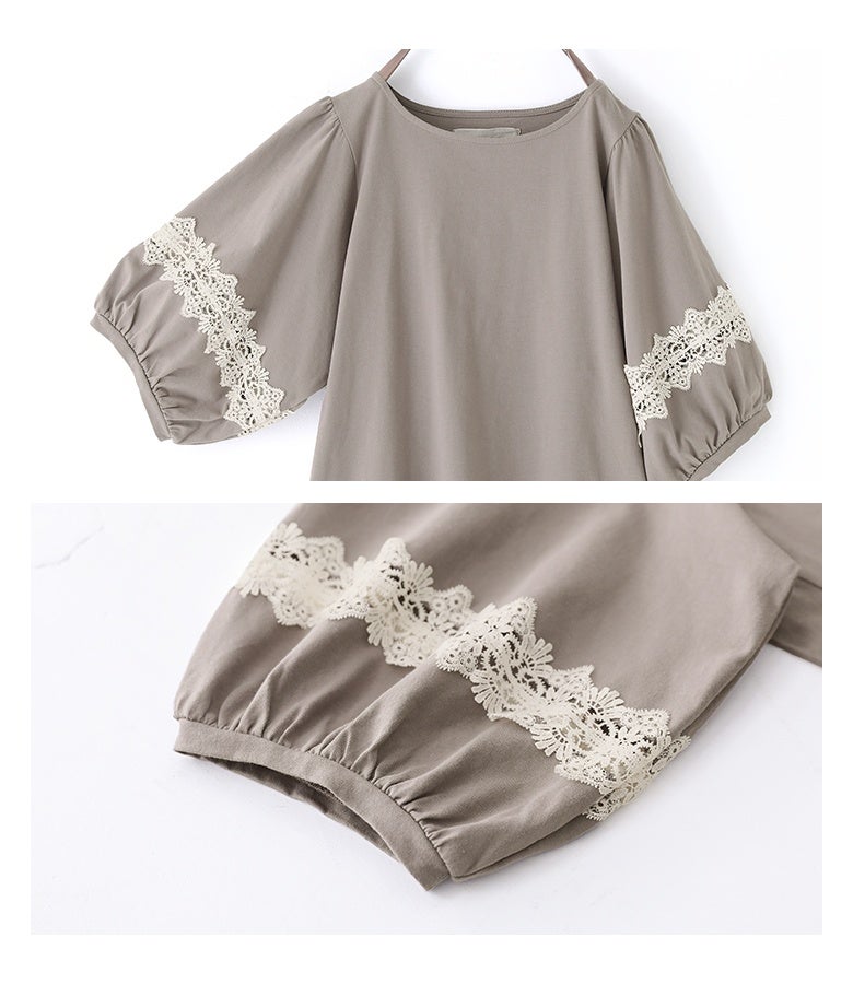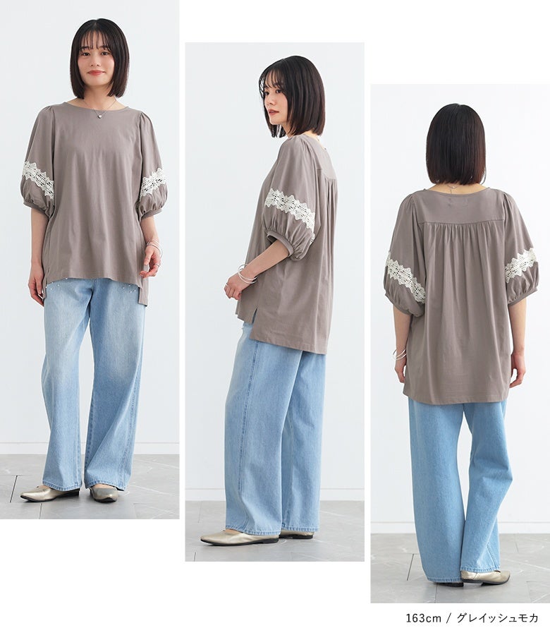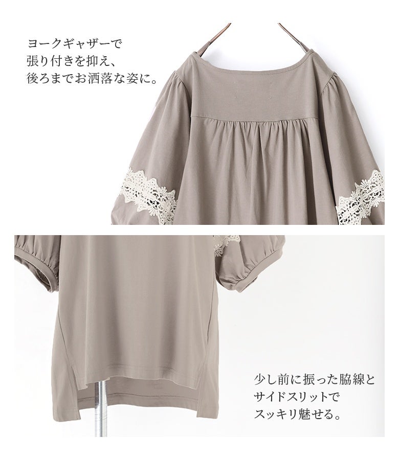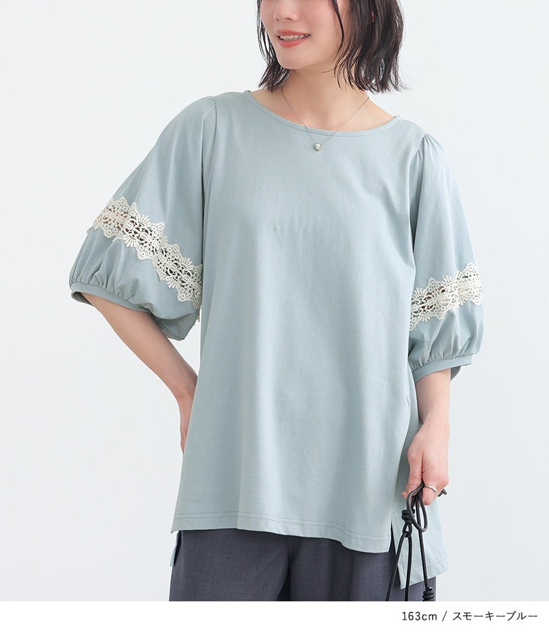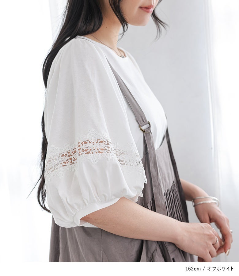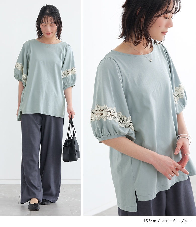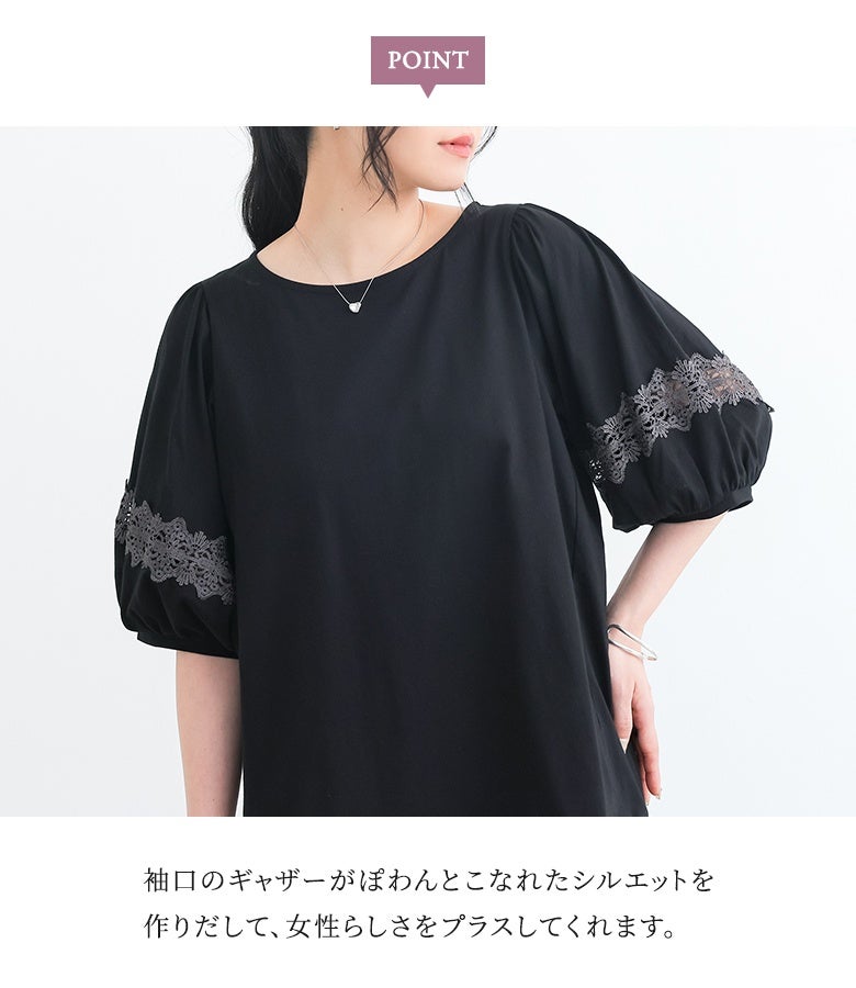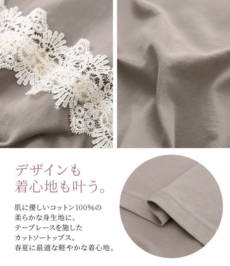 コットン100%の肌に優しい柔らかな生地を使用しているから、軽やかな着心地を実現。袖部分の透け感のある繊細なテープレースが、程よい肌魅せで女性らしさを放ちます。