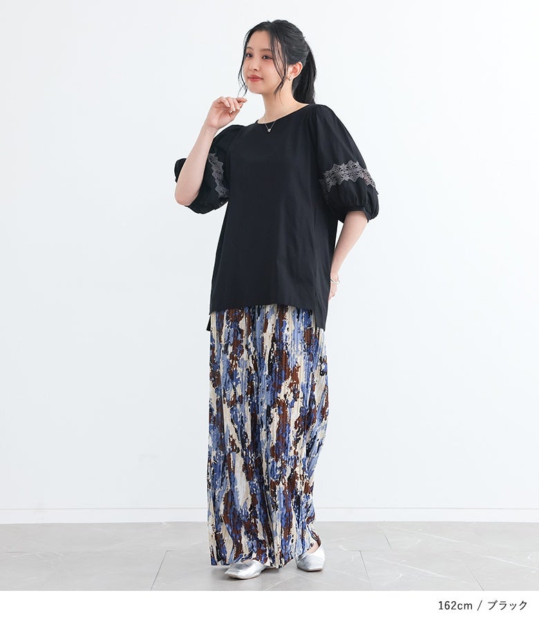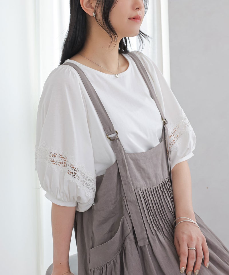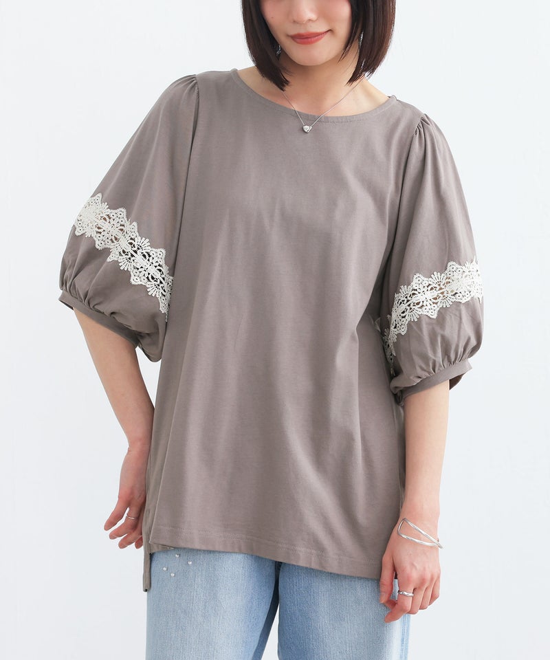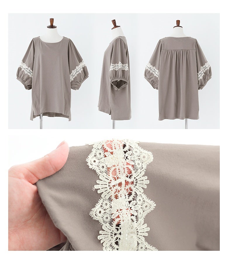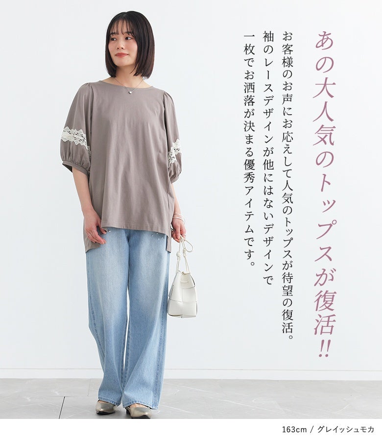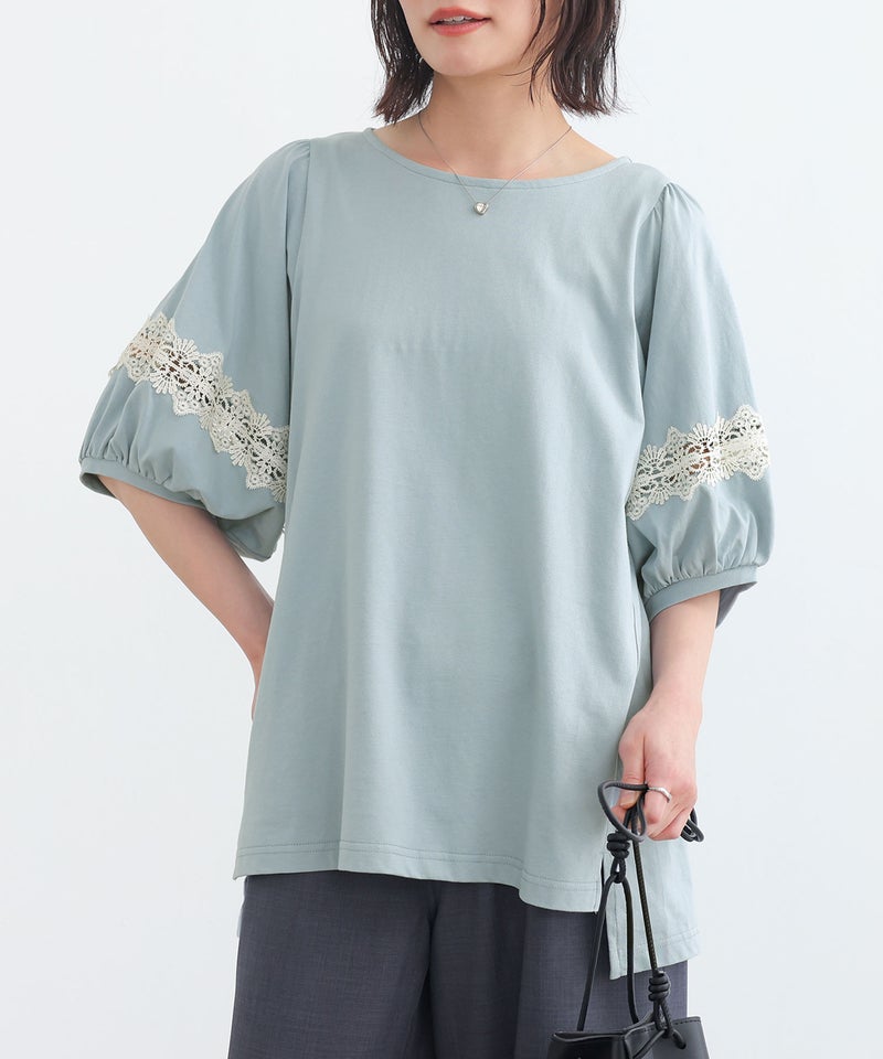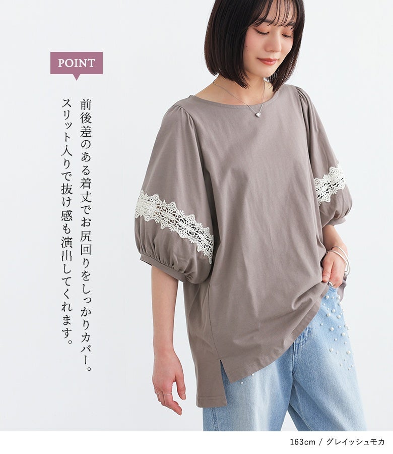 コットン100%の肌に優しい柔らかな生地を使用しているから、軽やかな着心地を実現。袖部分の透け感のある繊細なテープレースが、程よい肌魅せで女性らしさを放ちます。