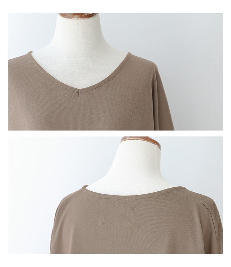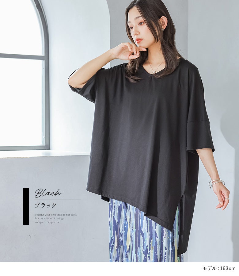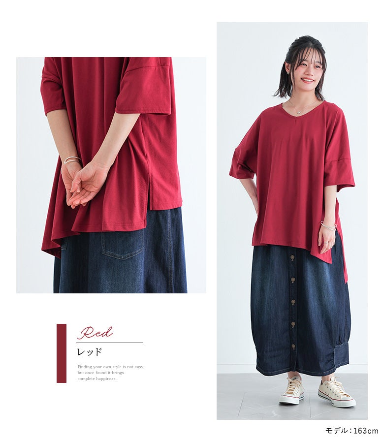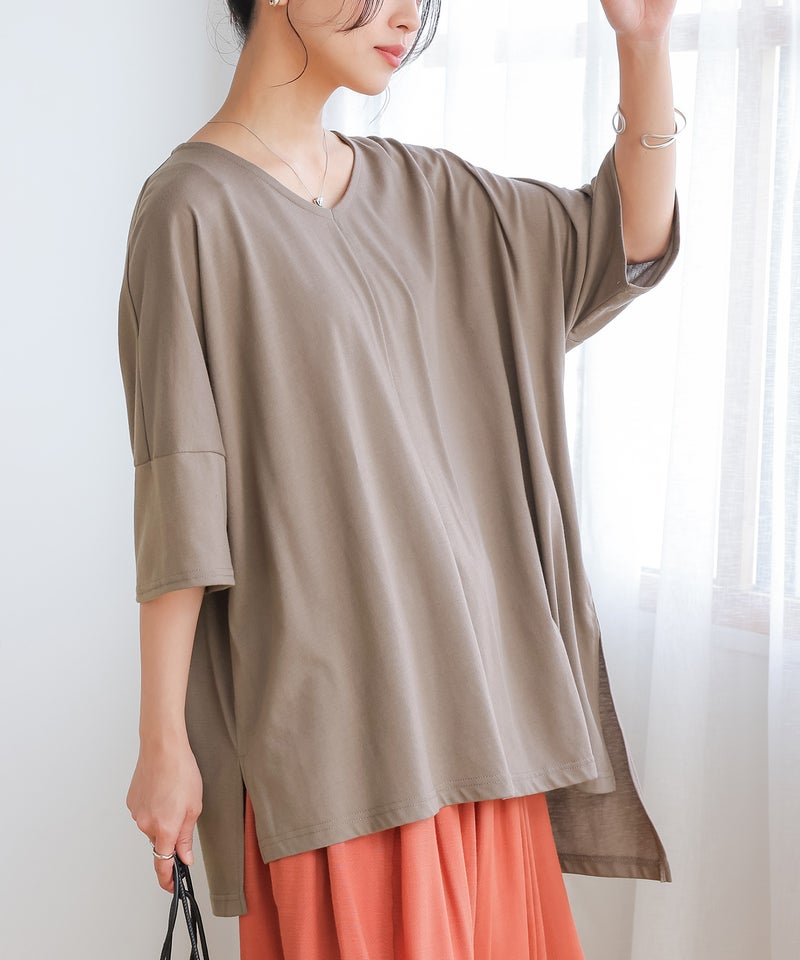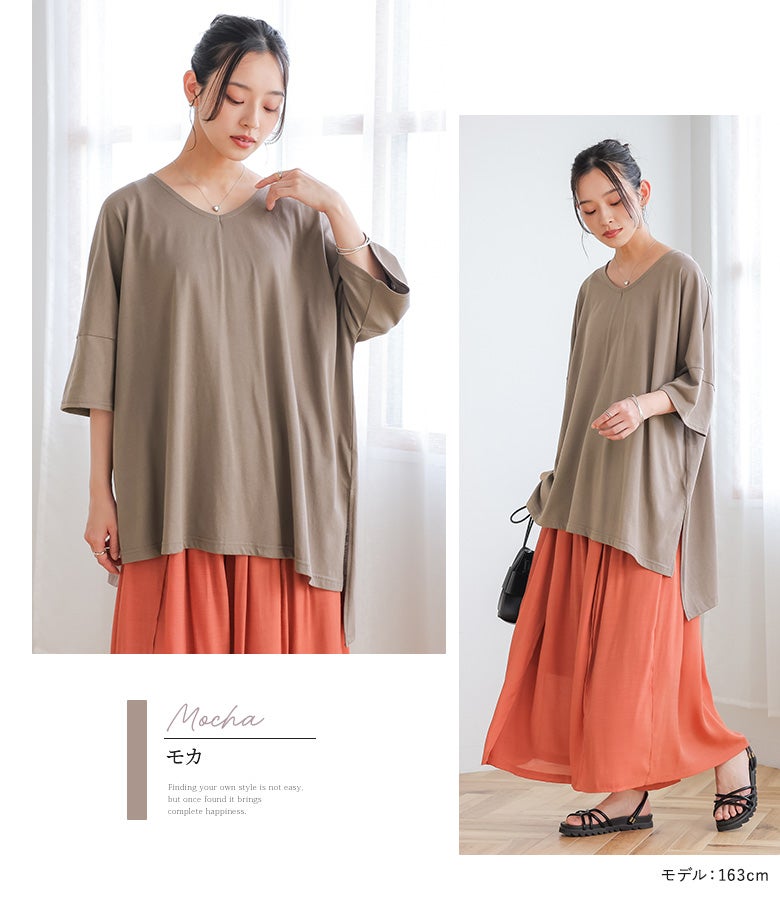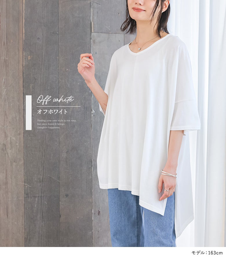 全体的にゆったりしていますが落ち感があり、大きすぎずにラフに着られました♪Vネックの開き具合もちょうど良かったです。