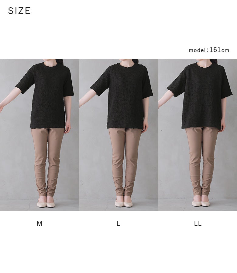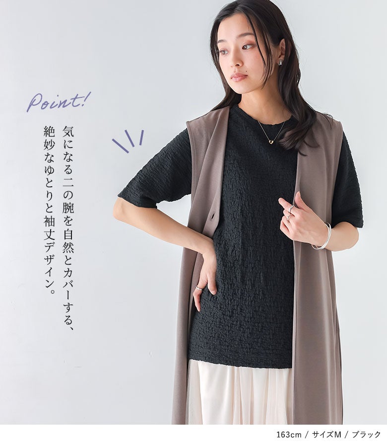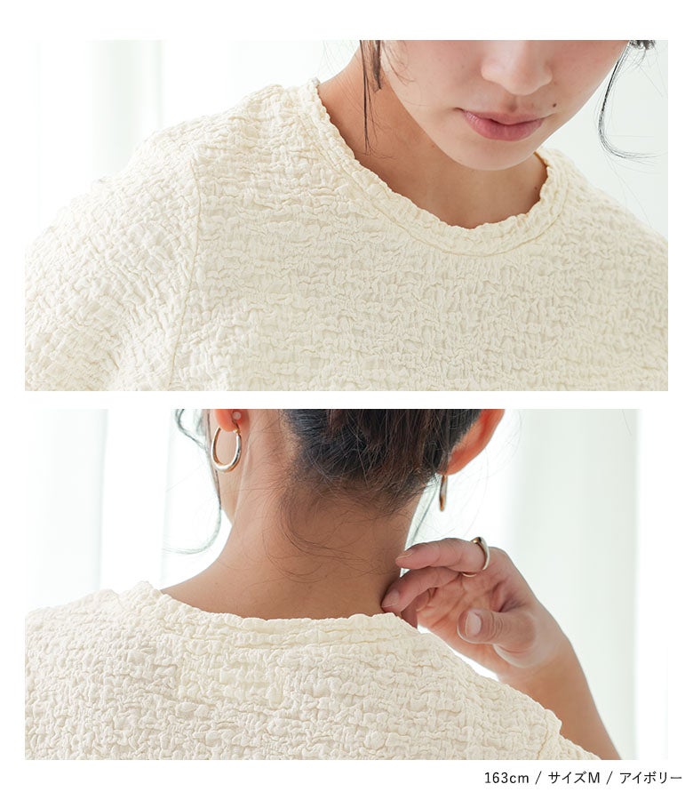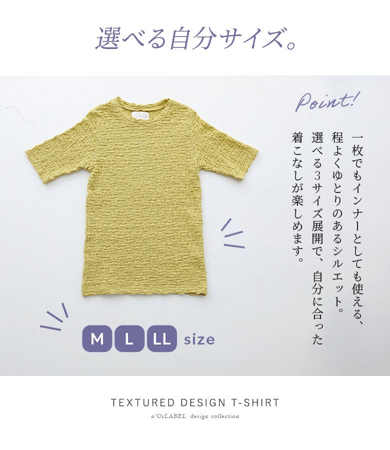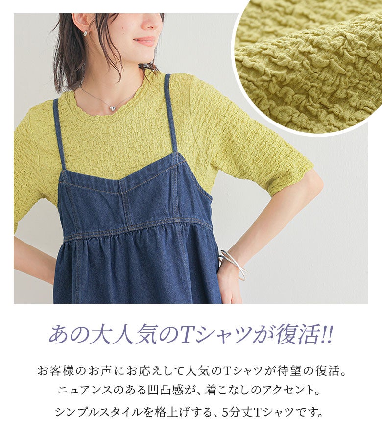 思わず触れたくなるぽこぽことした凹凸感のある素材で、着こなしにアクセントをプラス。シンプルでもお洒落見えする五分袖Tシャツです。