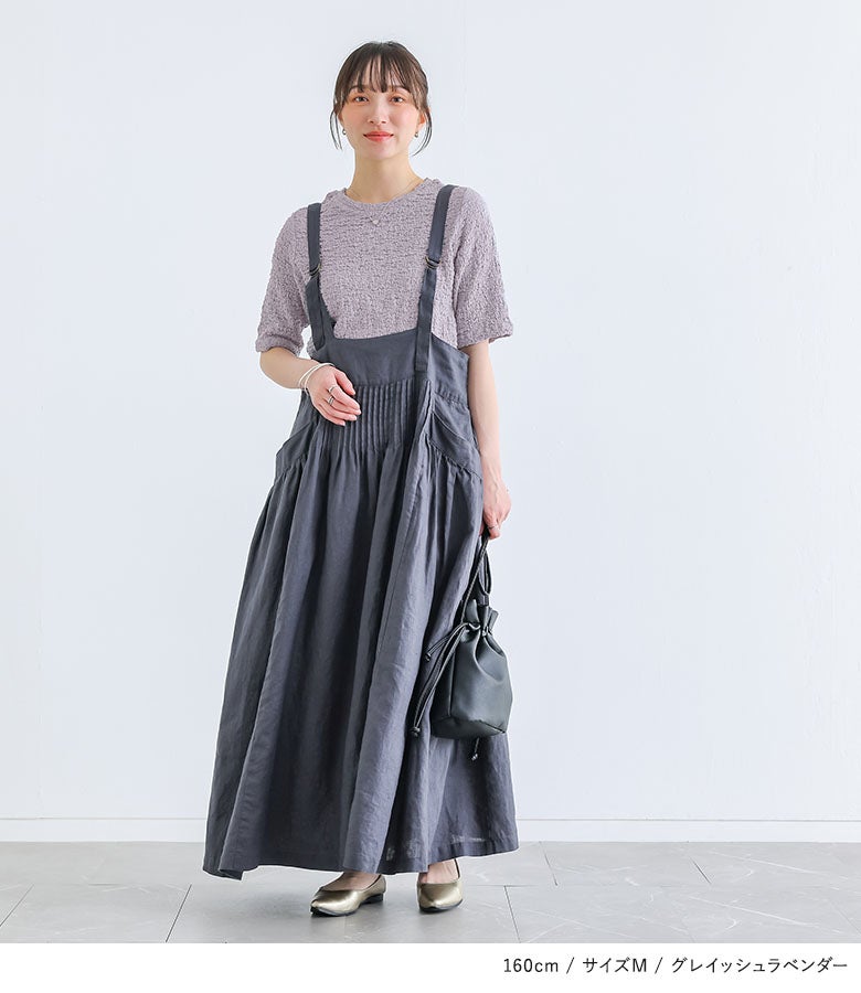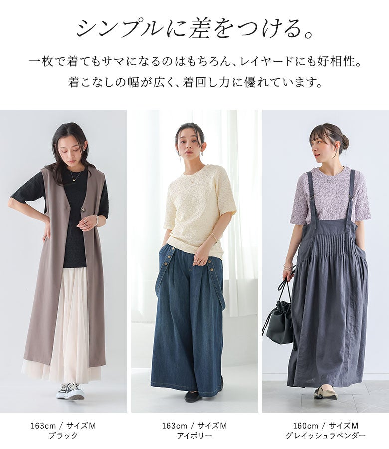 Mサイズは、全体的にフィット感があり、特にバストと二の腕が窮屈でした。Lサイズは、程よいゆとりもありつつスッキリと着られました。LLサイズは、ゆるっとオーバーサイズで体に沿いにくいサイズ感で着られました。私の場合は、サロペのインナー使いならLサイズ、1枚で着るならLLサイズを選びます。