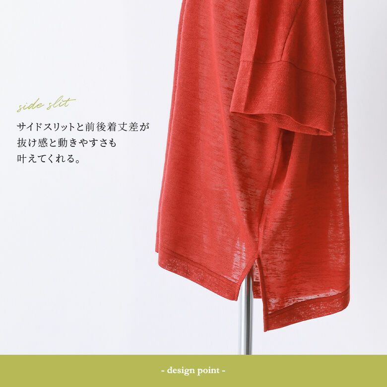 涼し気でさらっと透け感のあるスラブニットカットソー生地は、軽やかで心地良い肌触り。通気性も良く、暑い季節にも活躍します。