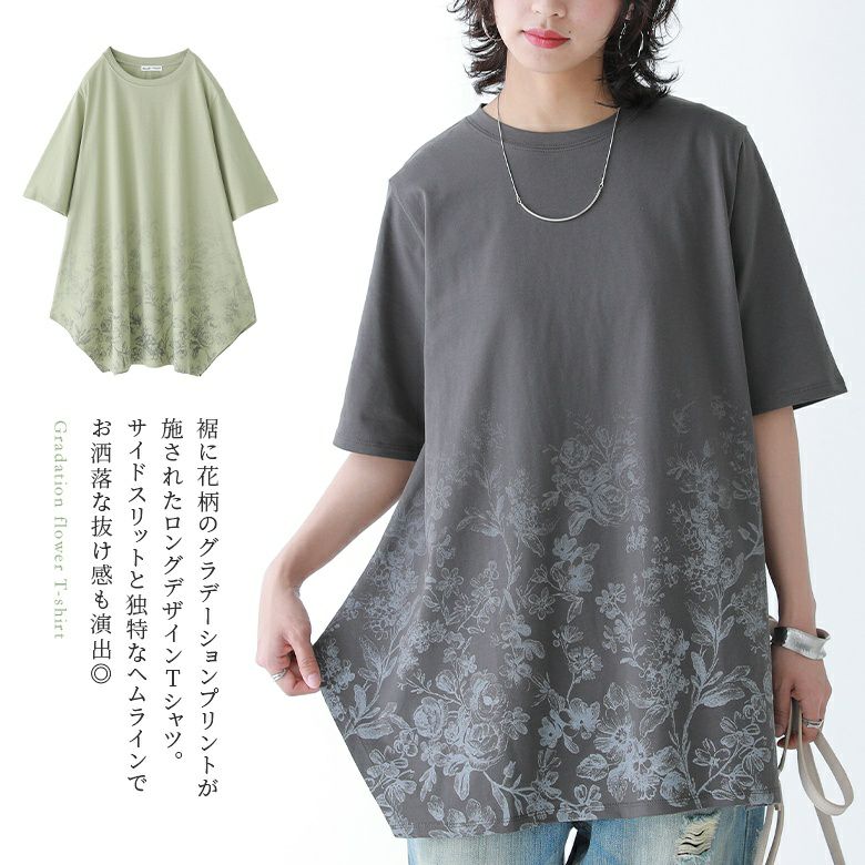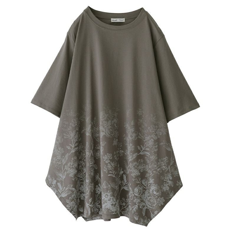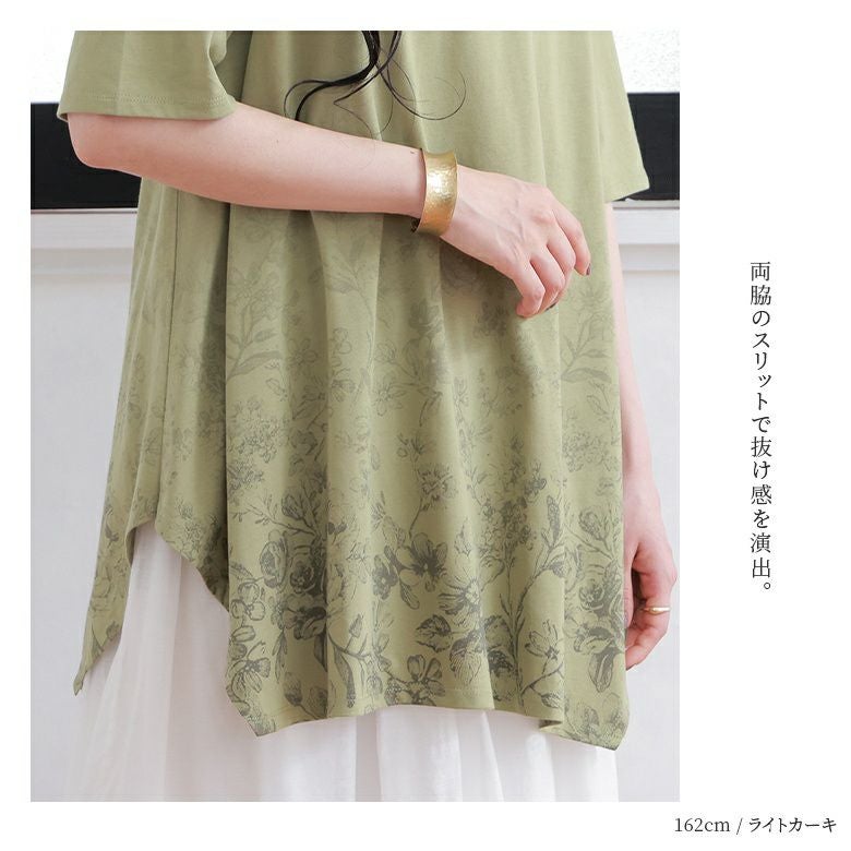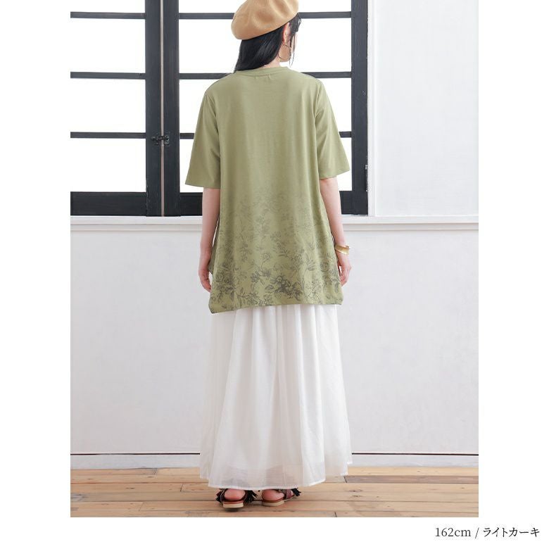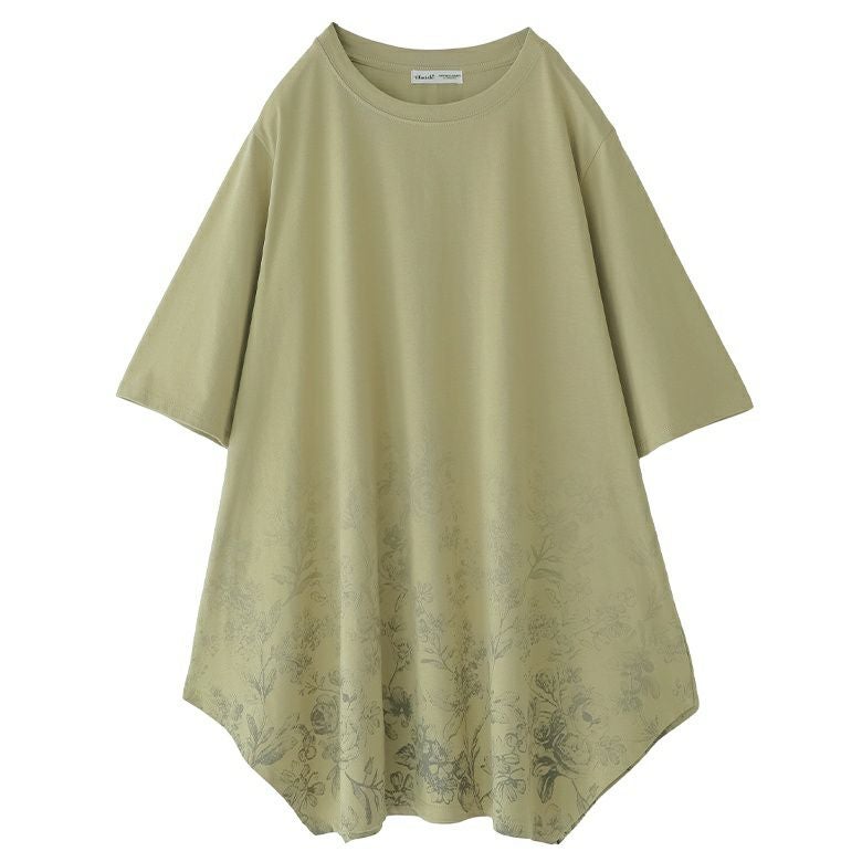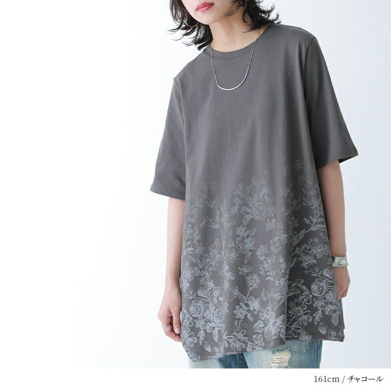 花柄のグラデーションプリントが施されたロングデザインTシャツ。