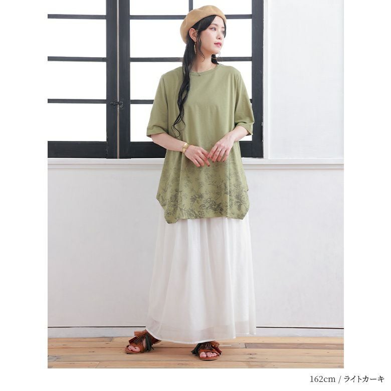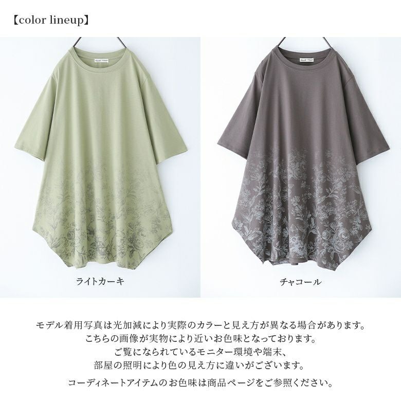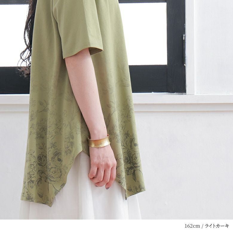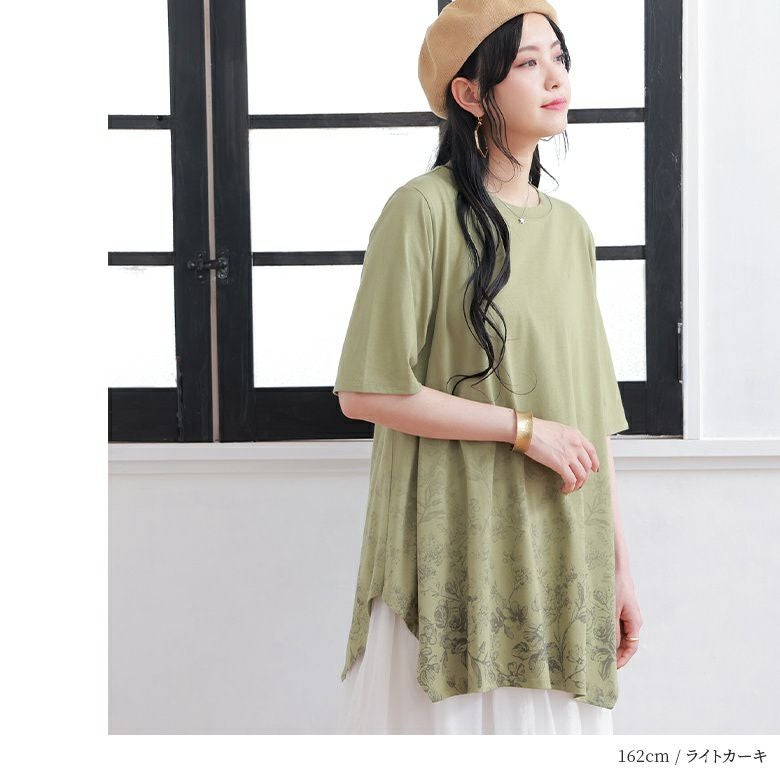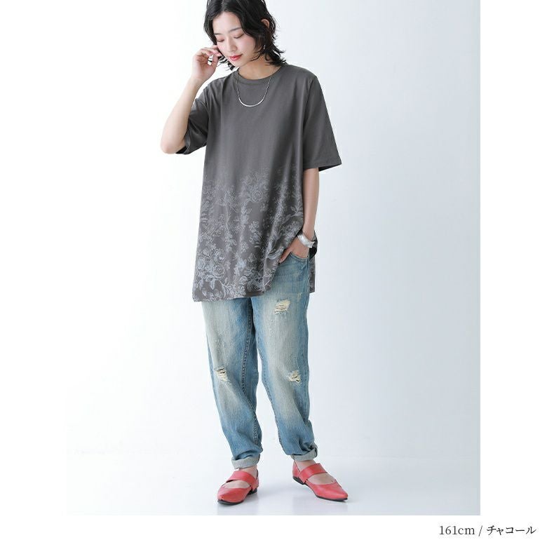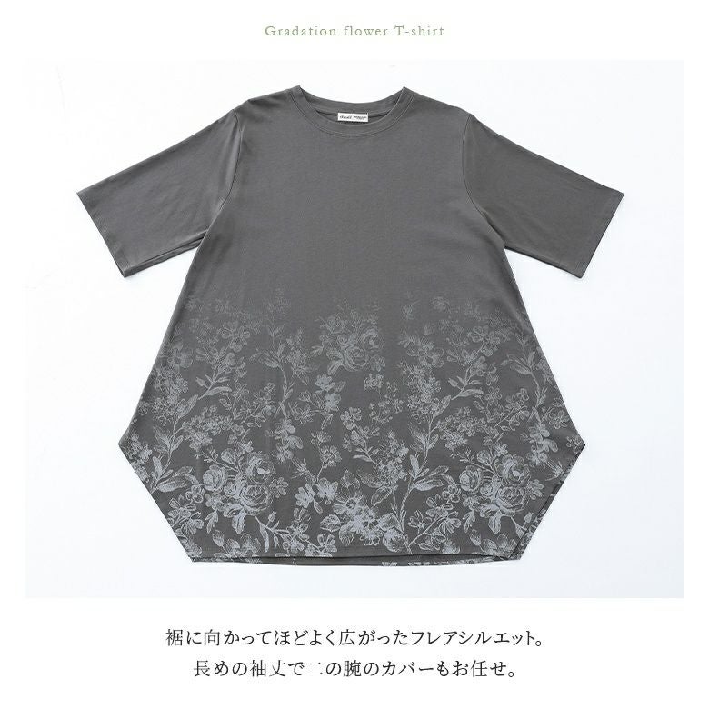 花柄のグラデーションプリントが施されたロングデザインTシャツ。