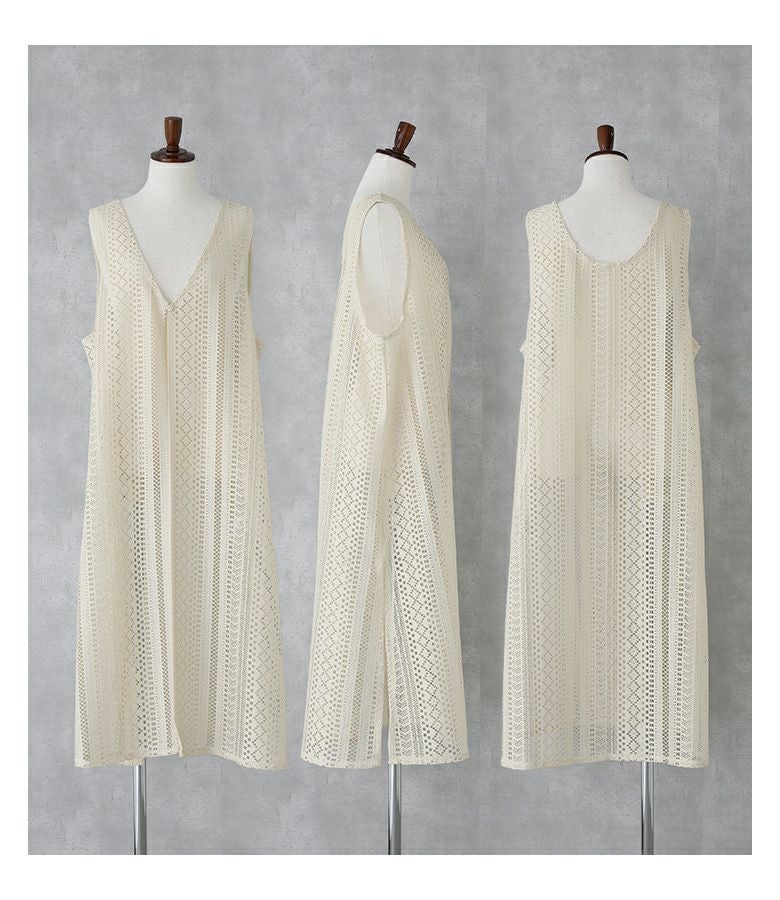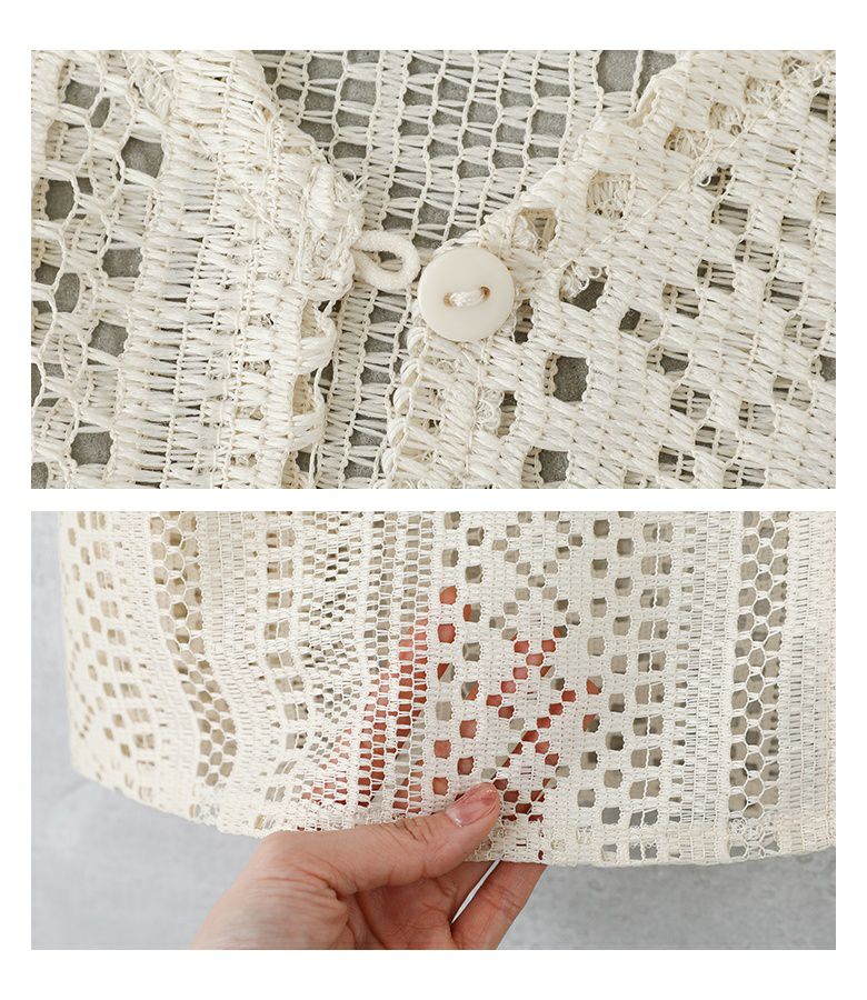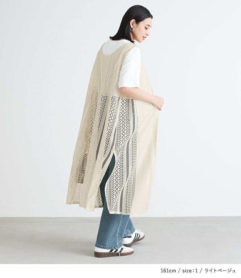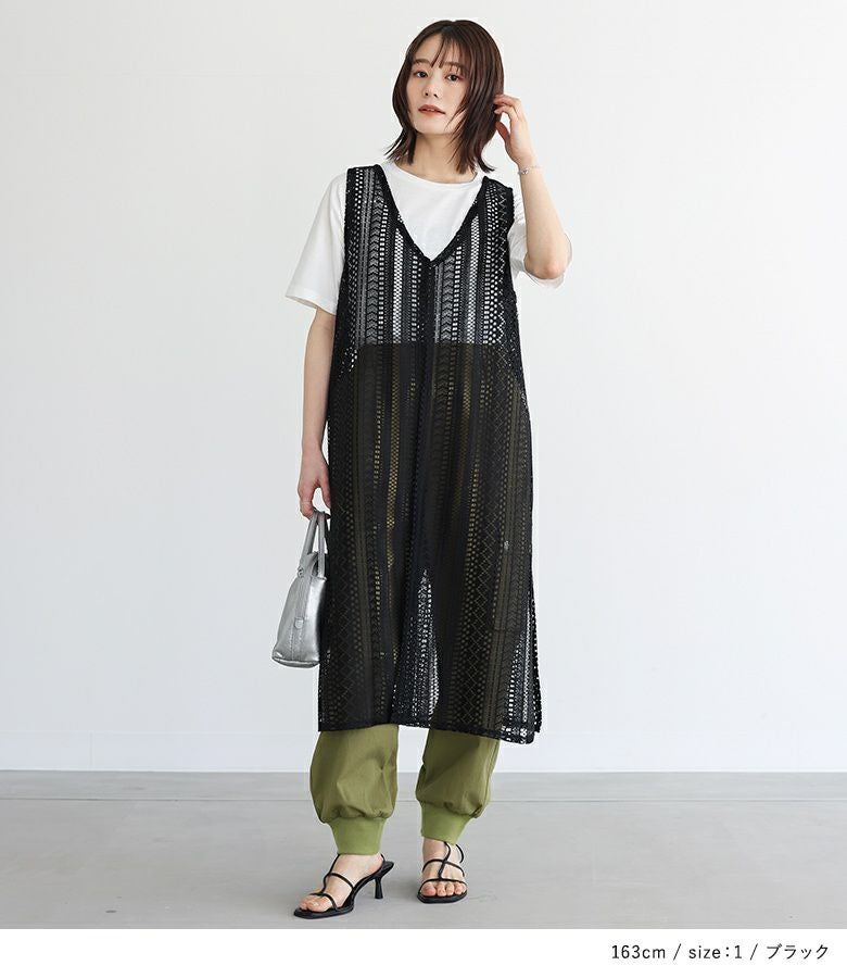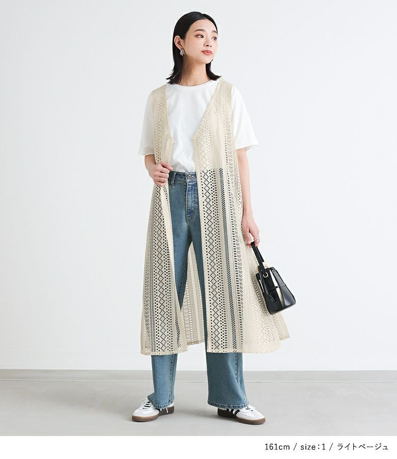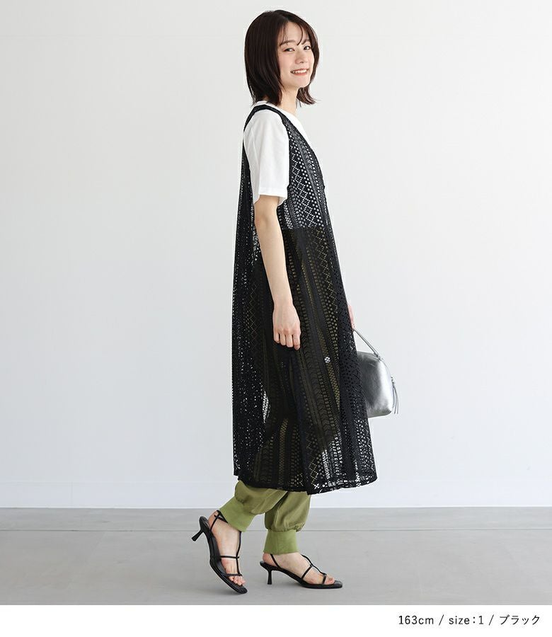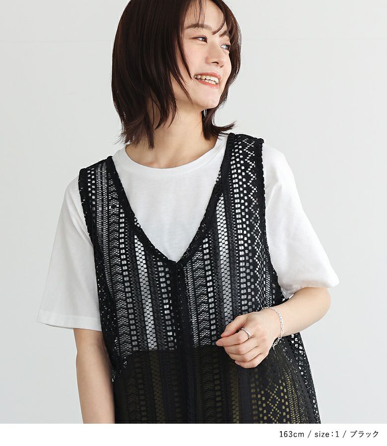 Tシャツとレースジレの着回せる2点セット。ジレはVネック&スリット開きで抜け感のあるデザイン。アームホールもゆとりがあるため、合わせるインナーを選ばずに着回していただけます。前ボタンが一つあり、ゴムセッパで留められる仕様になっています。Tシャツはどんなアイテムにも合わせやすい、ベーシックなデザインでこちらも着回しに活躍する一枚。