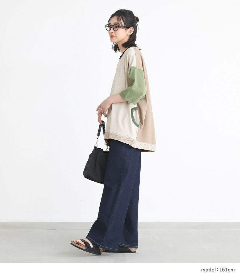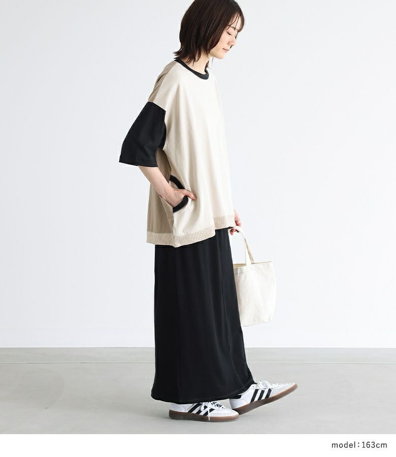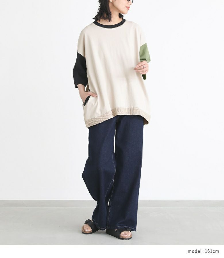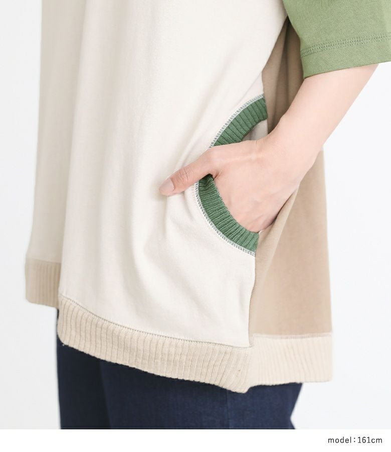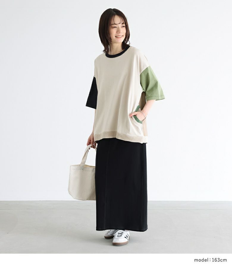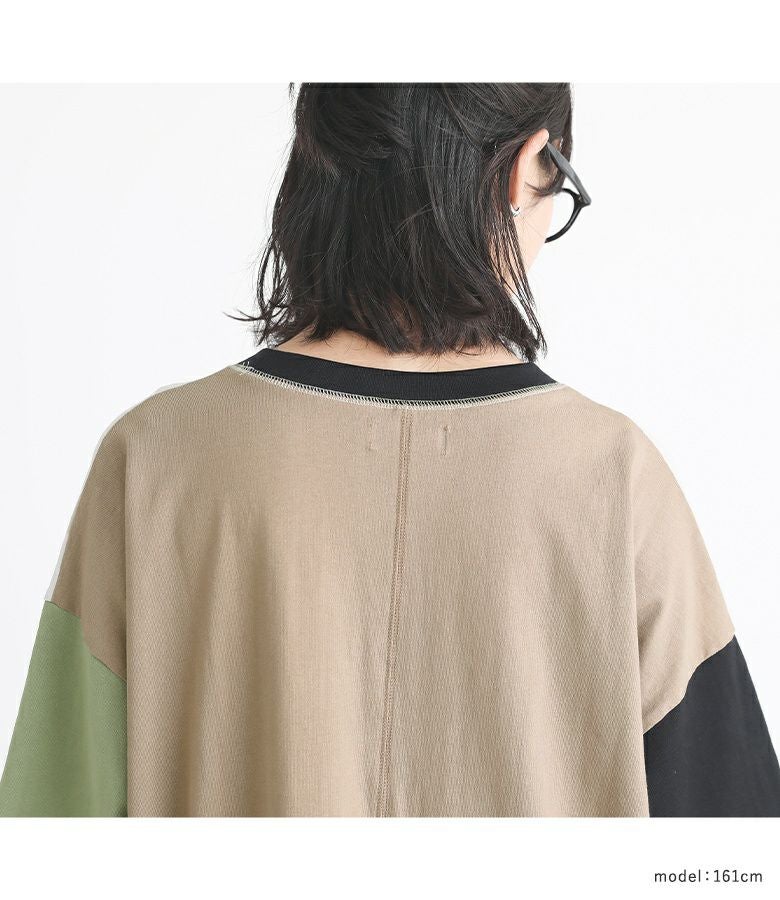 遊び心のあるマルチ配色が、個性的な印象に仕立てるTシャツ。両サイドのポケット口、襟ぐり、裾はニット仕立てのリブ切り替えでポイントになります。ゆるっとシルエットと前後差のある着丈で、ラフなこなれ感をプラスします。