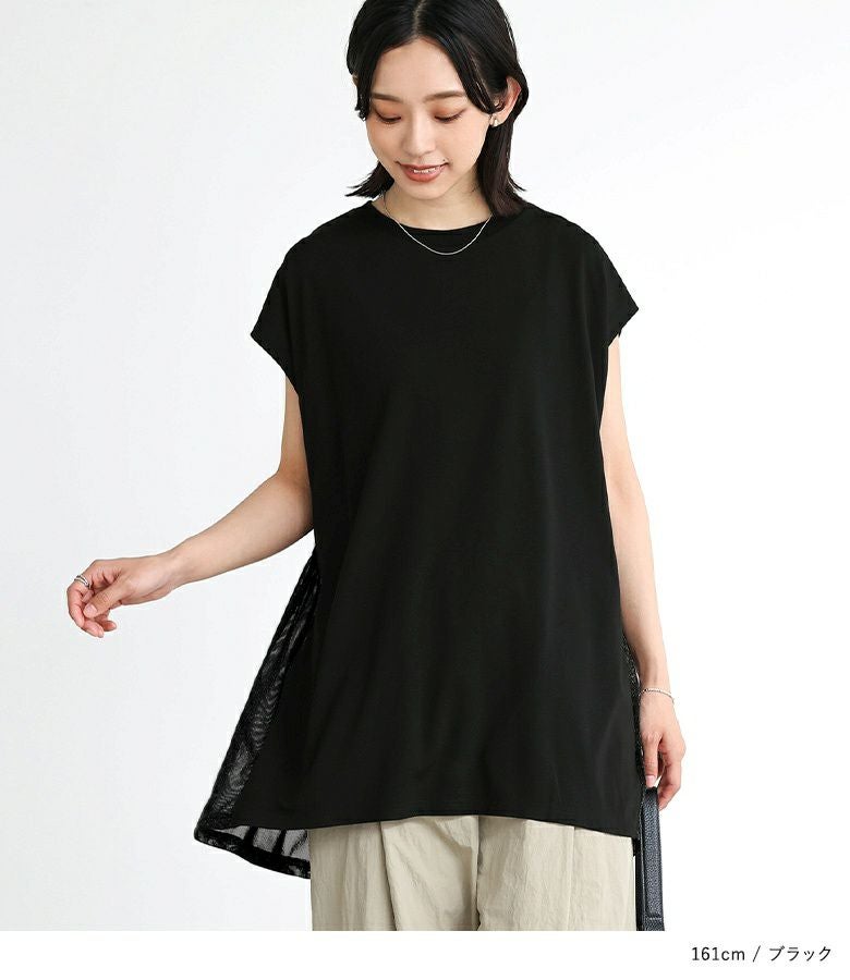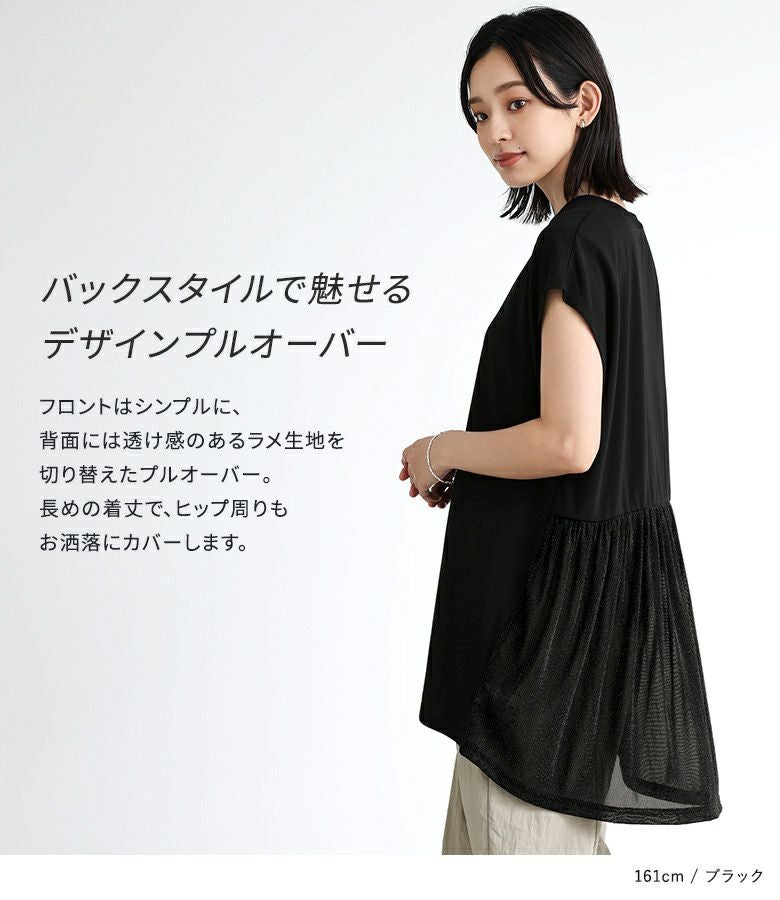 後ろの切り替え部分にシアー感のあるラメカットソー生地を使用したプルオーバー。涼やかに着られるフレンチスリーブも嬉しいポイントです。長めの着丈でヒップ周りもお洒落にカバー◎