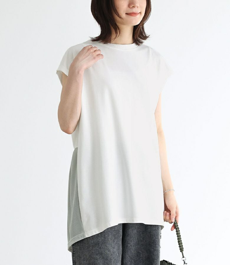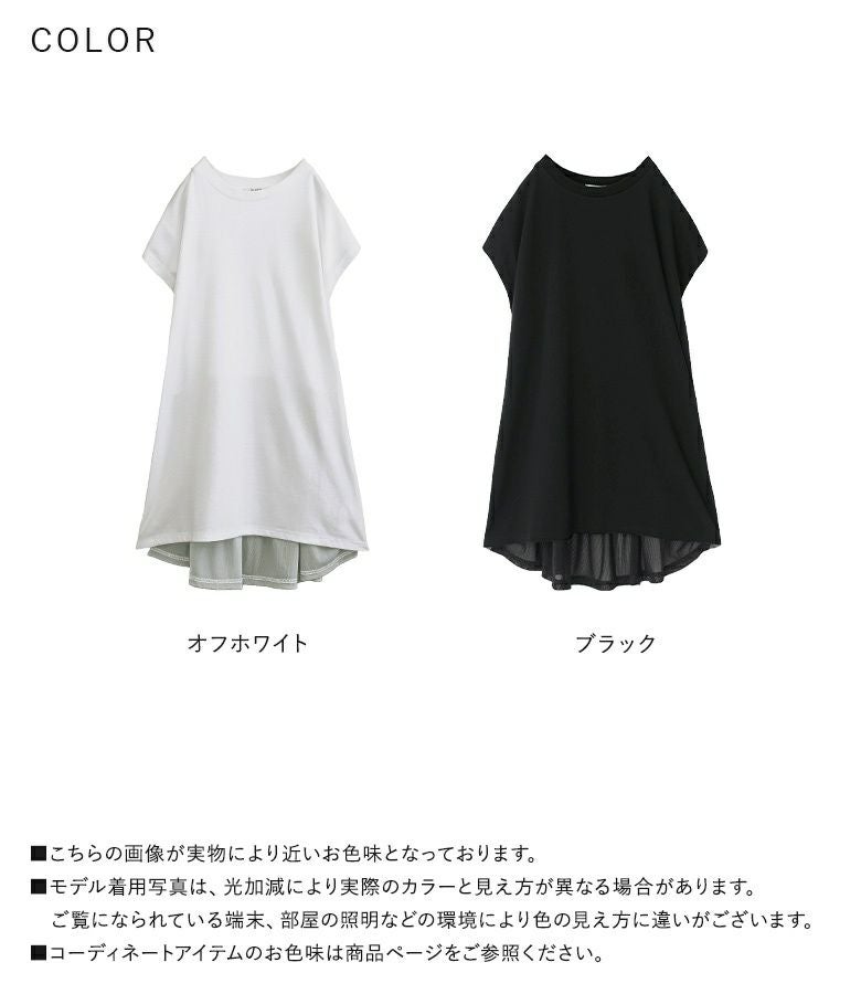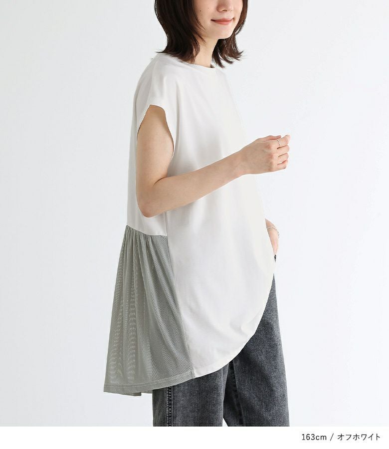 本体はレーヨン混で落ち感のある、滑らかな肌触りのカットソー生地。少し透け感のある、柔らかなシアーラメカットソー生地をドッキングしました。